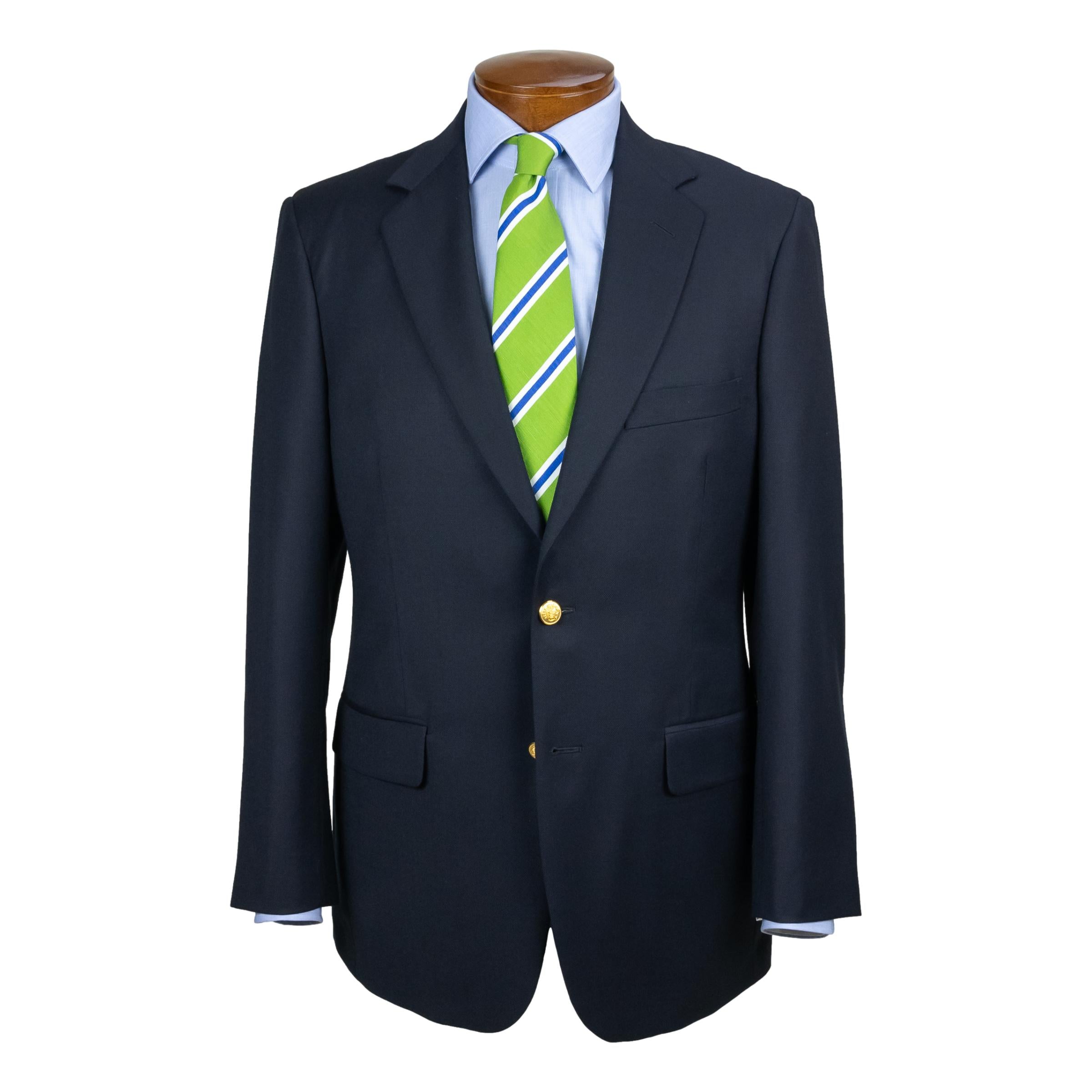 This exquisite 100% ultrafine basket weave wool blazer is cut in a Traditional Andover fit including a natural shoulder, canvas construction, premium bemberg lining, and brass buttons. This 2-button darted blazer features a center vent, front flap pockets, and a chest welt pocket. Made in USA for The Andover Shop. Single breasted. If you are looking for a less traditional, slimmer fit, check out our New Andover Fit or Trim Cambridge fit blazer models. If you are looking for a 3-button blazer, check out our Traditional Fit Super 120's model blazer. If you don't see your size below or it is out of stock, give us a call we can make one for you.