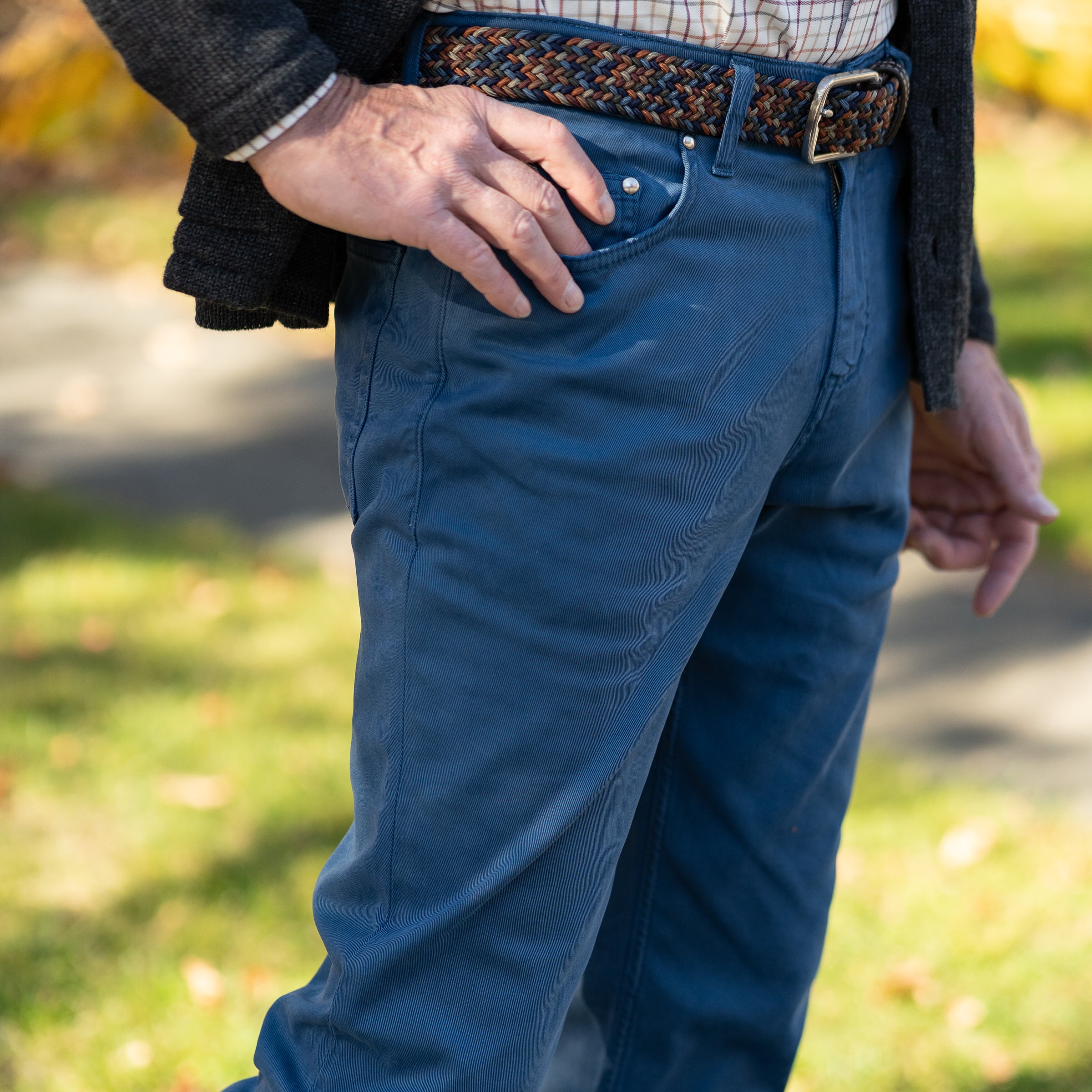OurCotton and Cashmere Stretch 5-Pocket Trouser, meticulously crafted in Italy for The Andover Shop. Fashioned from a blend of 44% cotton and 4% cashmere, 50% Lycra, and 2% elastane this soft and durable fabric ensures comfort and style, making it the ideal choice for your fall and winter wardrobe.