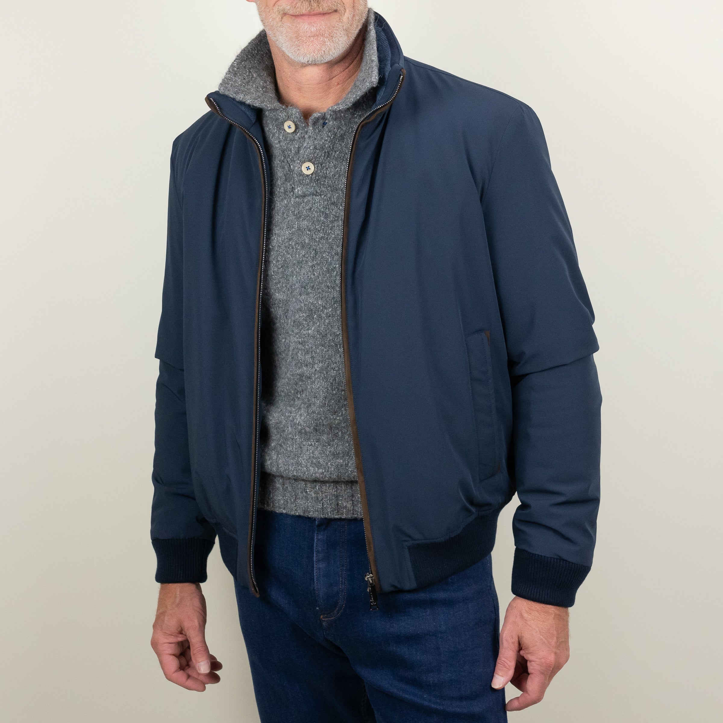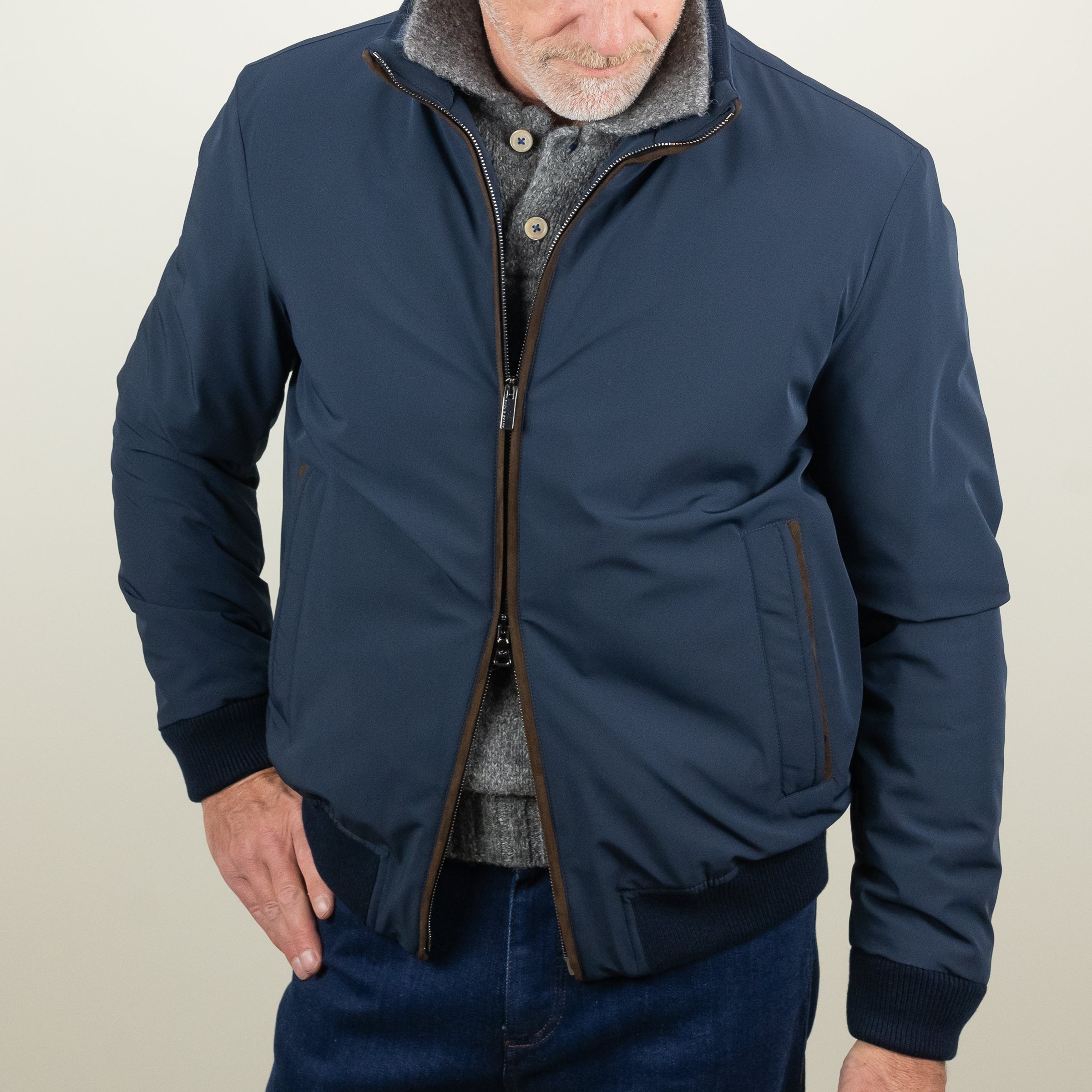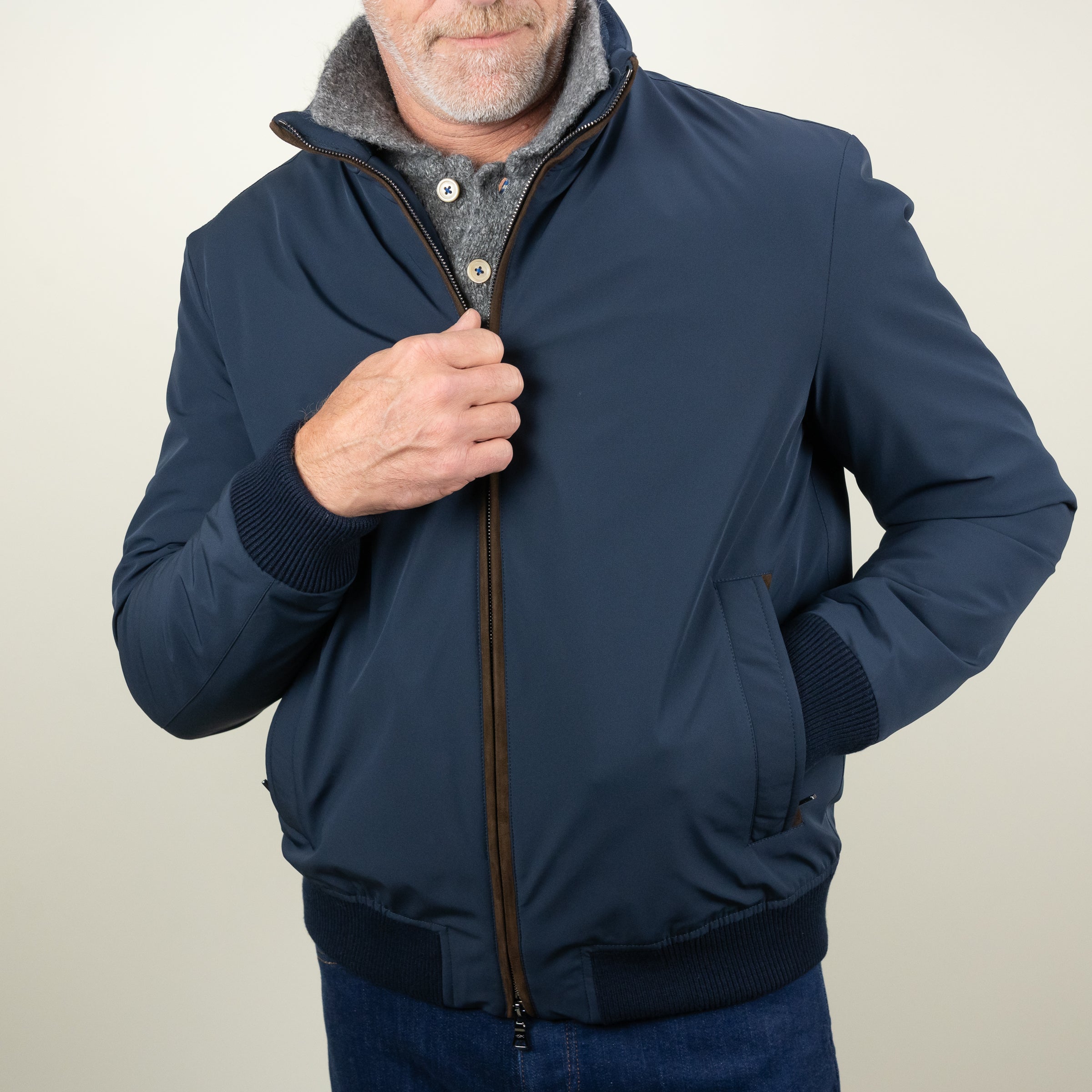 Introducing the RE - 4X4 Stretch Bomber, an innovative update to the iconic Typhoon fabric. This new version combines sustainability and stretch with the renowned water and wind resistance. Designed for both performance and comfort, the bomber features a regular fit and is crafted from Microfibre Stretch fabric. Details include a two-way zip front with a matte-black finish, alcantara trim, angled zippered pockets, primaloft insulation, rain and wind protection, ribbed cuffs and waist, and E.M.W protection that shields the body from electrosmog. Made from 88% Polyester and 12% Elastane, with a 55% Polyester and 45% viscose lining, this jacket offers both style and durability.