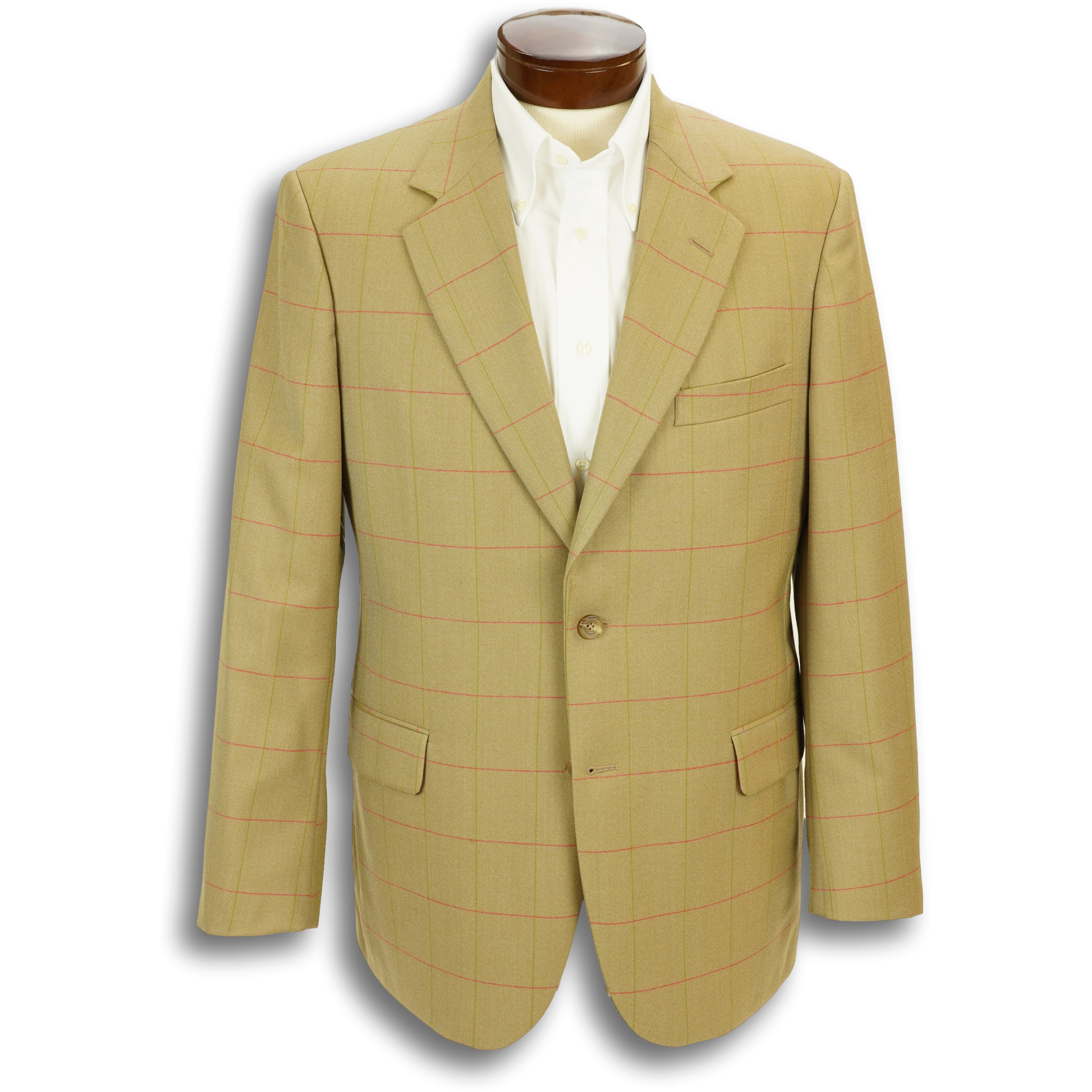 Year round weight tan ground jacket with an olive and red windowpane. Cut in the traditional Andover Shop fit with 2 button, undarted, and a center vent. Fabric woven for The Andover Shop in Scotland. Tailored in the USA. For Special Orders we will give you a call to discuss sizing. Special Orders take between 4 and 6 weeks.