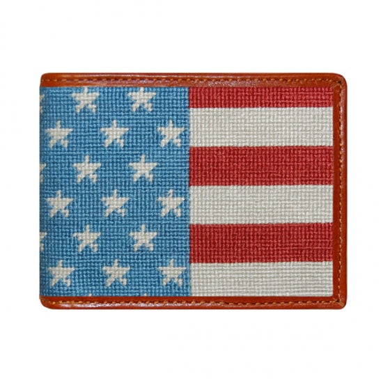 This Smathers & Branson hand-stitched stars and stripes needlepoint card wallet is finished with English bull hides tanned in Italy. This slimmer wallet style (4” by 3”) provides enough room for cards, cash, and an ID, but does not take up too much room in a pocket or bag. Great for carrying in your front pocket and something less bulky for a night on the town!