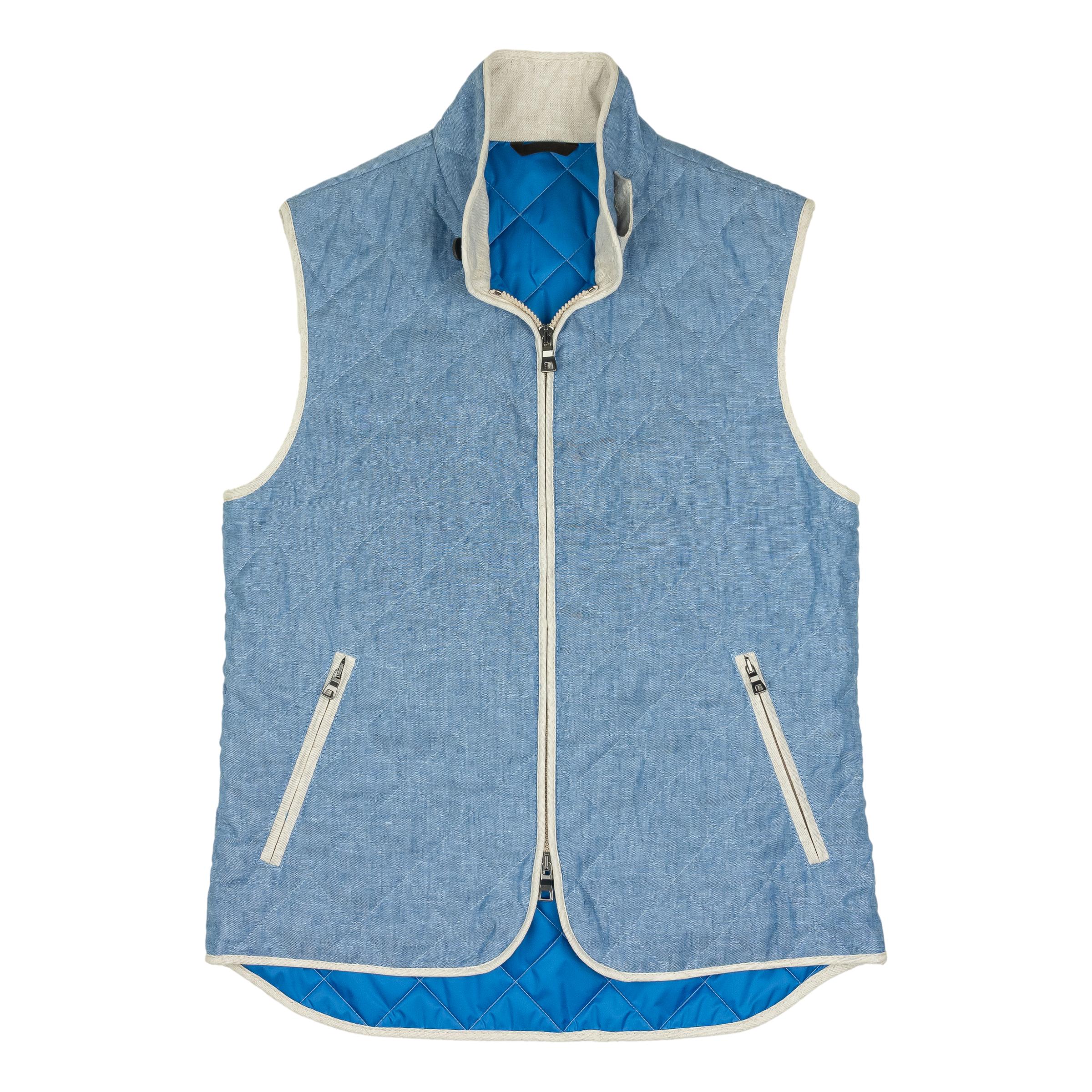 Discover the timeless charm of the Sky Blue Linen Quilted Waterville Vest, meticulously crafted in Italy for The Andover Shop.  The front-button closure adds sophistication, making it a versatile layering piece for both casual and semi-formal occasions. Perfect for elevating your style while staying cool and comfortable. Made from premium Italian materials and hardware, it seamlessly combines style and functionality. For the perfect fit, we suggest choosing a size one up from your jacket size. Embrace Italian craftsmanship and style with the Sky Blue Linen Quilted Waterville Vest – where sophistication meets everyday wear.