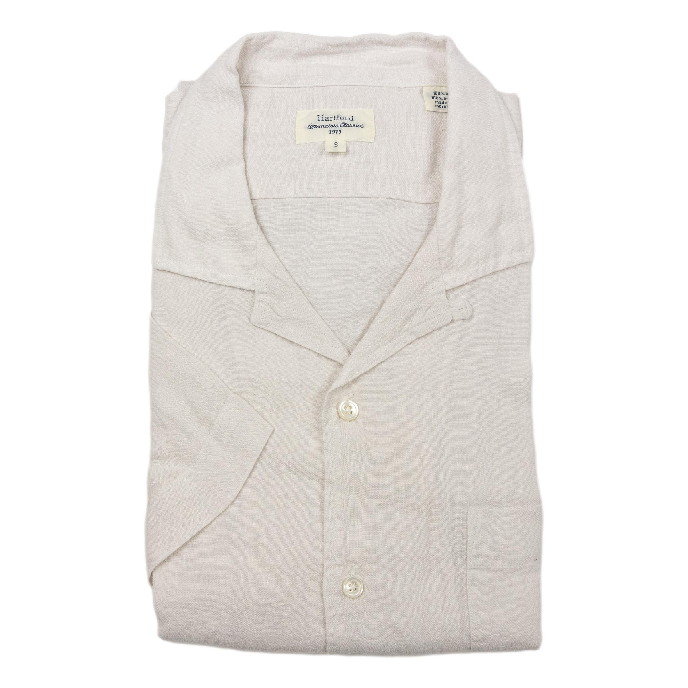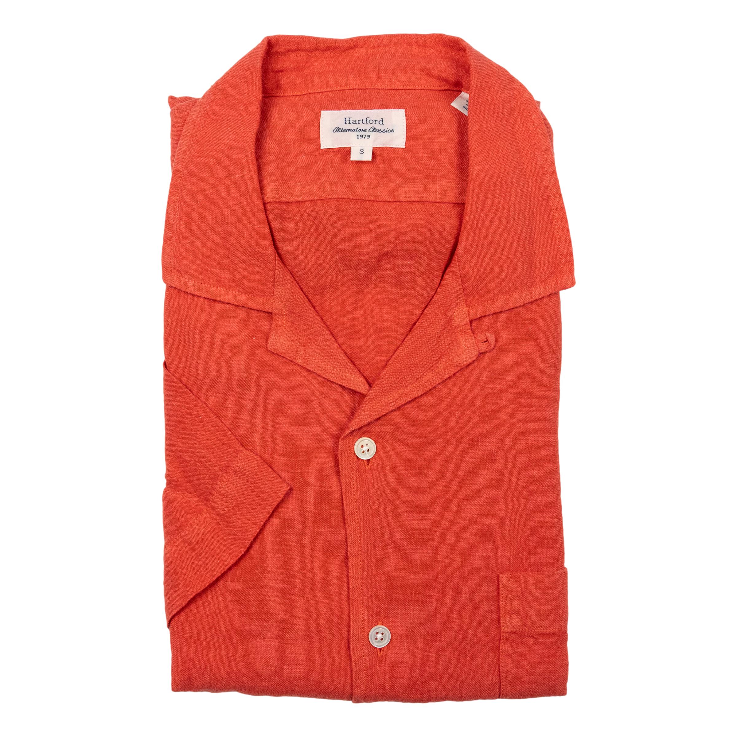Solid Linen Palm Shirt, features a chest pocket and exposed buttoning. Its regular fit is universal and its slightly open collar is a classic in our wardrobe. The quintessential short sleeve casual shirt, timeless and essential in all circumstances. This shirt is garment-dyed, giving the color a subtle, washed effect and softening its feel. Regular fit.