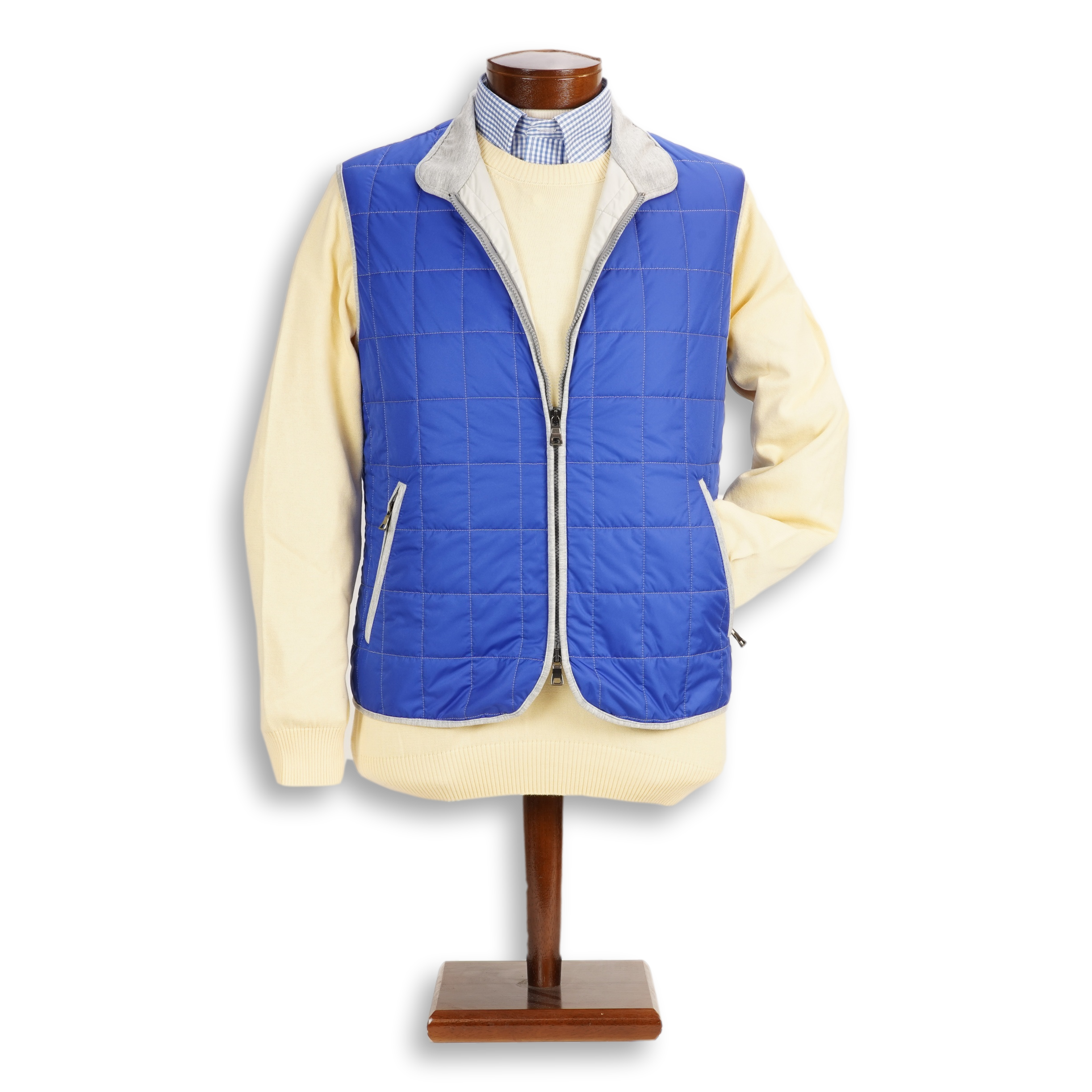 The iconic Waterville Theo quilted vest is made from 100% water resistant nylon and is complete with a 2-way front zipper, zippered hand pockets and two interior zippered pockets. This lightly quilted vest is designed with versatility in mind and is the perfect Spring golfing vest. We recommend going one size up from your jacket size. Made in Italy for The Andover Shop using all Italian materials and hardware.