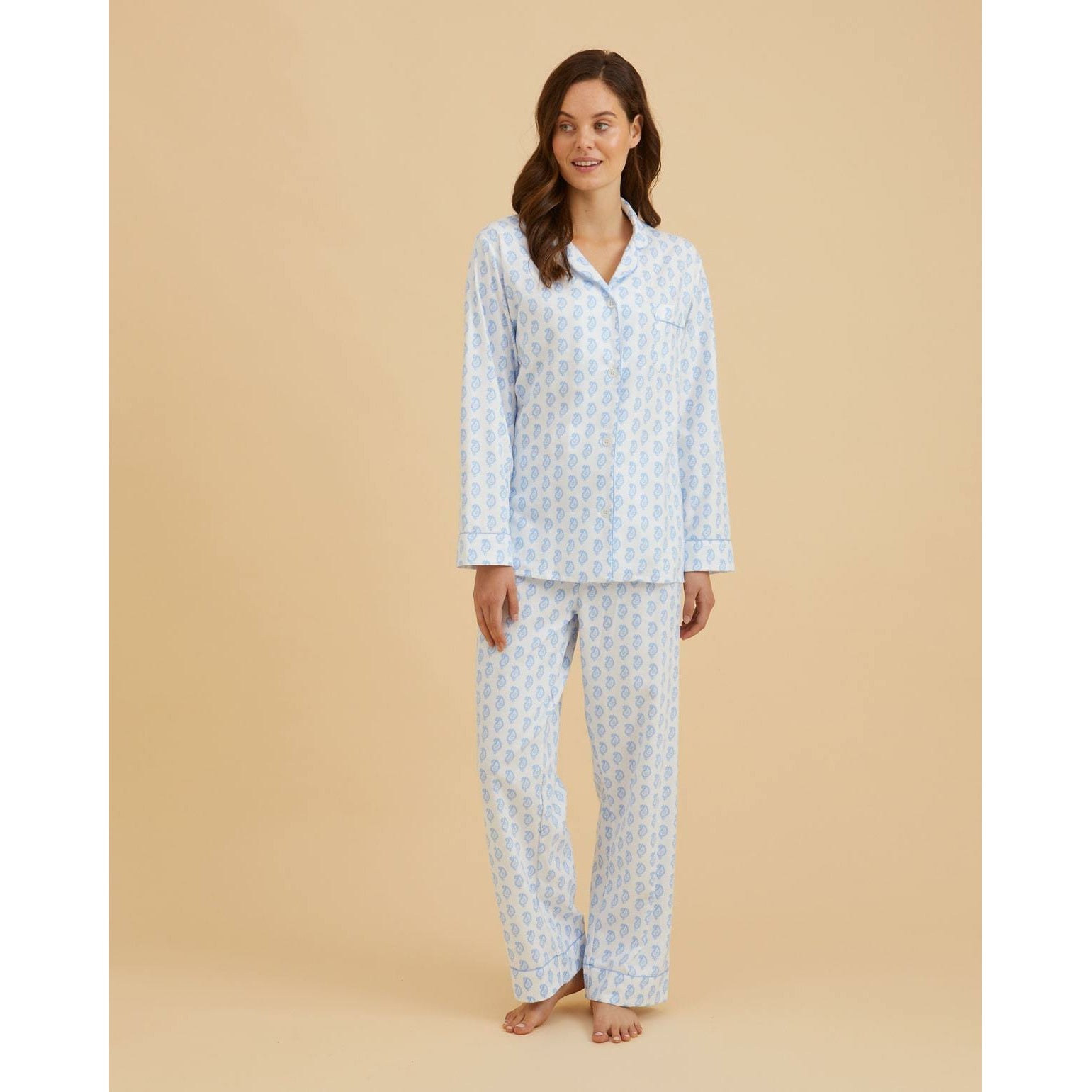 Soft, 100% brushed cotton makes these pyjamas super cosy all year long. Whether you wear them for sleeping or lounging these pyjamas will ensure you look smart and stylish. Generously cut with a square-hemmed jacket and a half-elasticated waist with a self-fabric tie trouser. Both are finished with piping. Flannel.