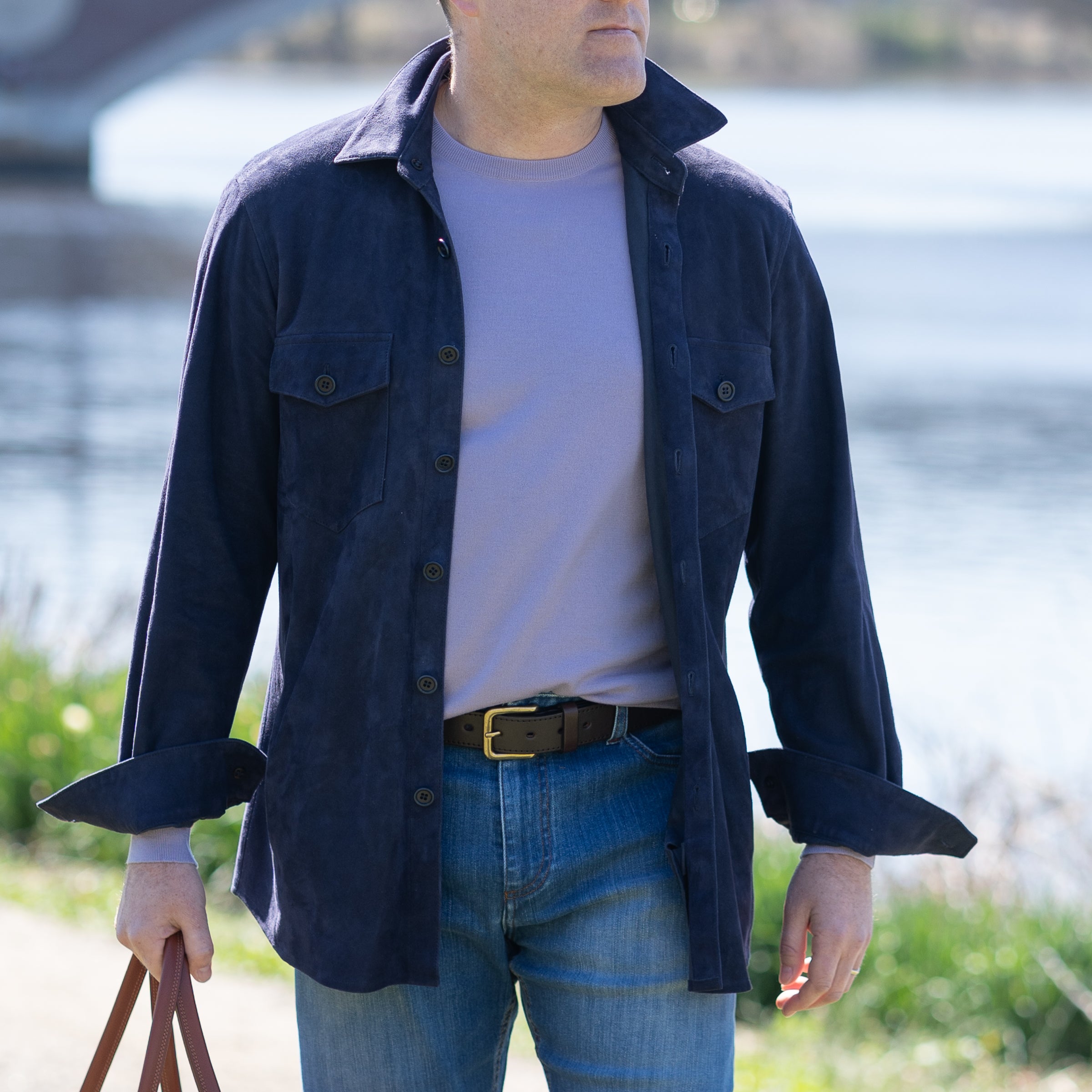 Introducing the Andover Shop's Italian Suede Leather Work Shirt – a masterfully crafted piece designed for both style and functionality. Handmade in Italy, this shirt exudes quality and attention to detail. Fashioned from natural Italian leather, it boasts a rich texture that adds a touch of luxury to any ensemble. The chest patch pockets and hip hand pockets enhance its utilitarian appeal. The full-button front allows for versatile styling options, making it suitable for various occasions. Elevate your wardrobe with this distinctive leather work shirt that seamlessly blends Italian craftsmanship with timeless design.