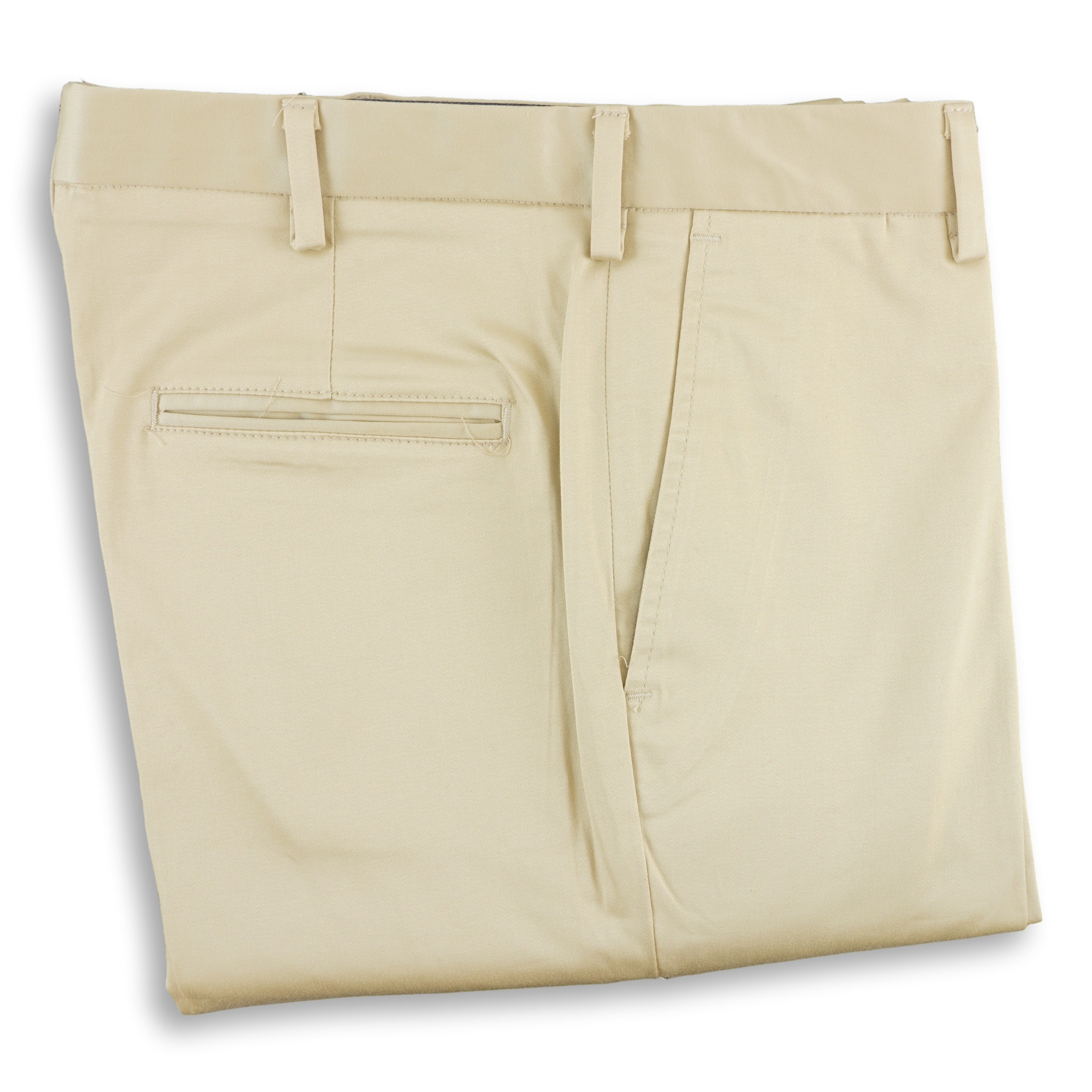 Made from 95% Cotton and 5% Sateen twill, these trousers are perfect for everyday wear and the subtle stretch provides maximum comfort and improved fit. Traditional trouser construction with interior clasp and button. On seam front pockets and rear slit pockets with button. Medium length. Plain front. Made in the USA.