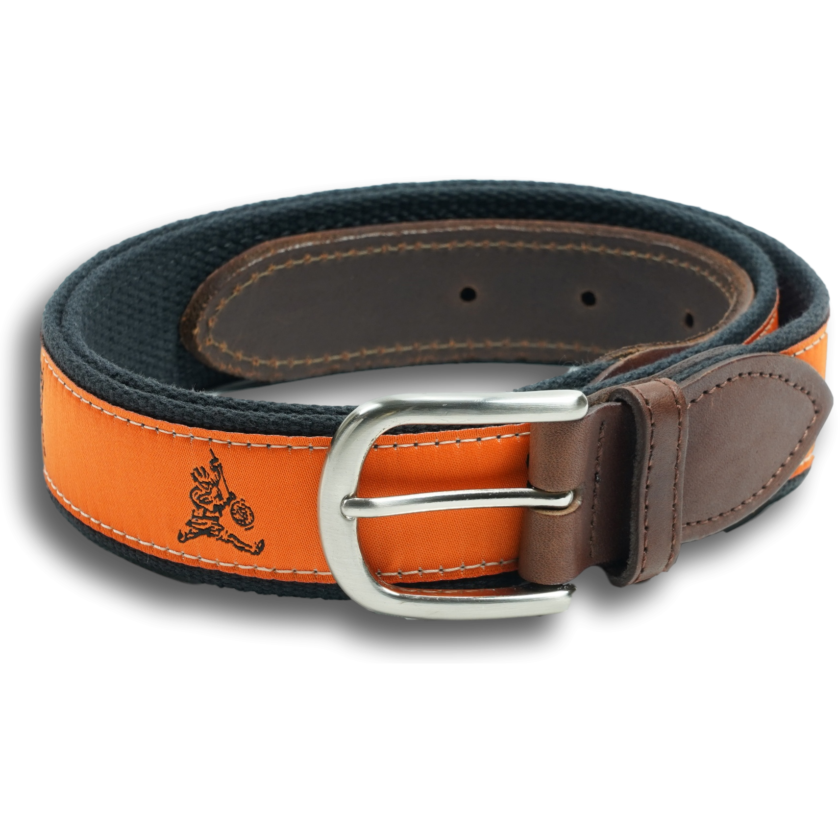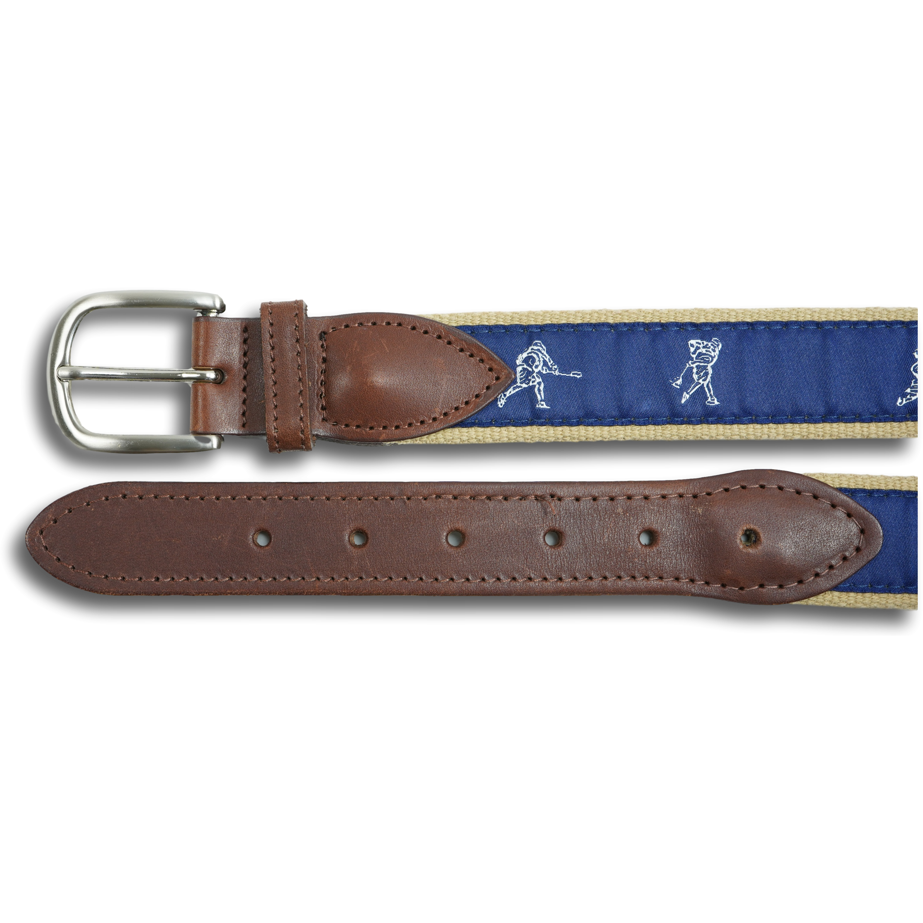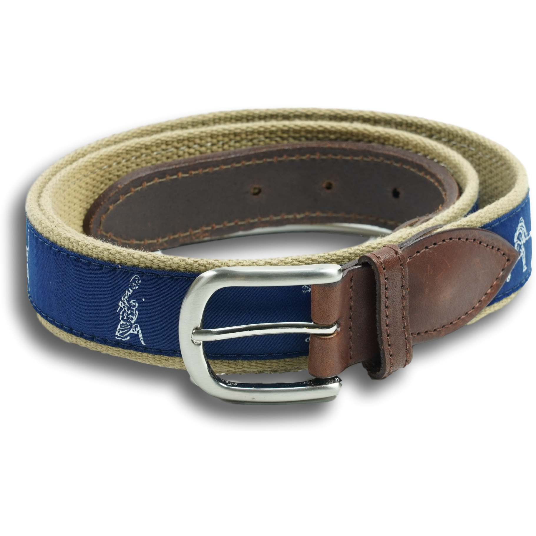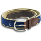 Each belt has an artist-designed signature ribbon stitched onto 100% cotton webbing and fully stitched leather tabs cut from full grain Latigo leather. Each leather tab belt is finished with solid cast brass buckles in a brushed silver finish. Proudly Made in Maine.