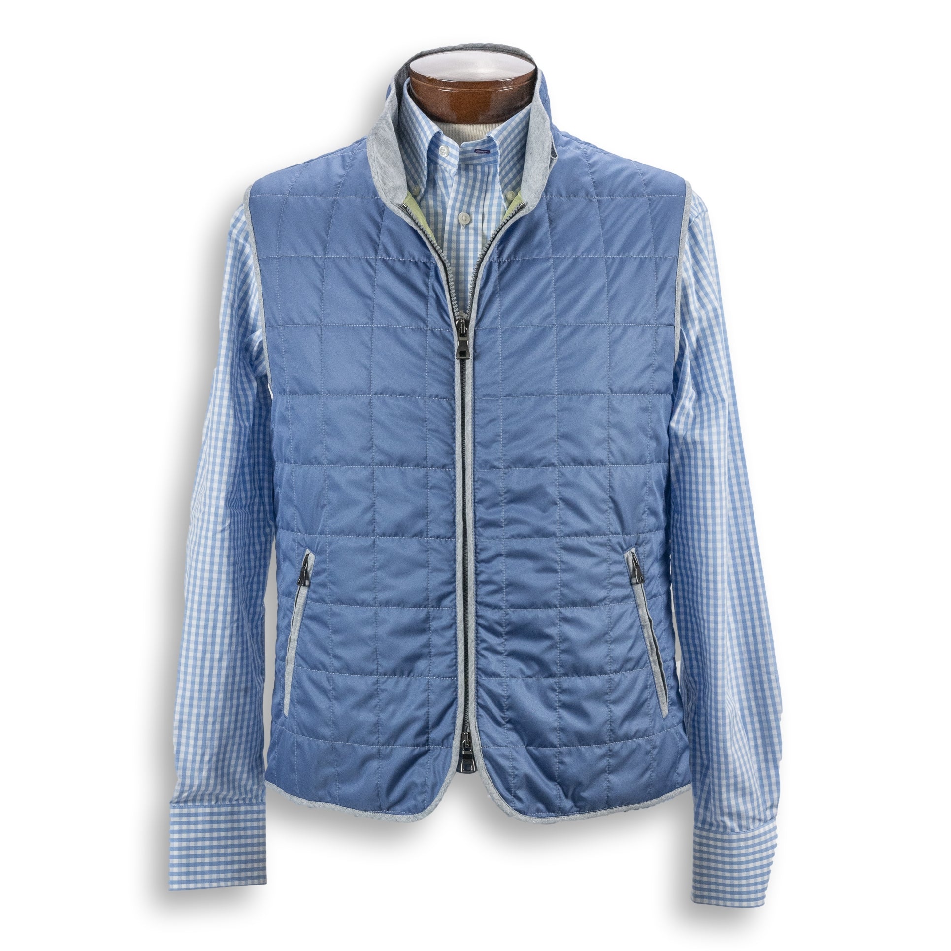 The iconic Waterville Theo quilted vest is made from 100% water resistant nylon and is complete with a 2-way front zipper, zippered hand pockets and two interior zippered pockets. This lightly quilted vest is designed with versatility in mind and is the perfect Spring golfing vest. We recommend going one size up from your jacket size. Made in Italy for The Andover Shop using all Italian materials and hardware.