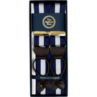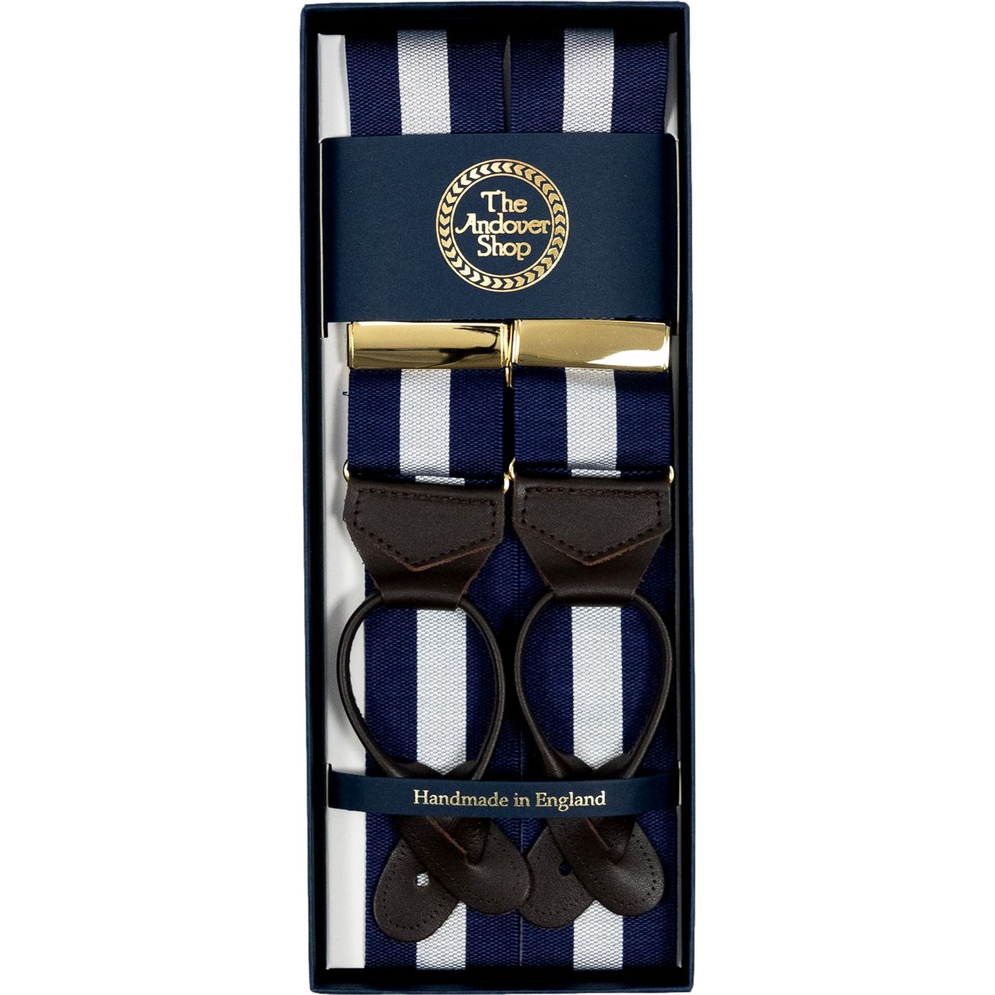 Navy and white striped rigid barathea braces. Made in England for The Andover Shop.