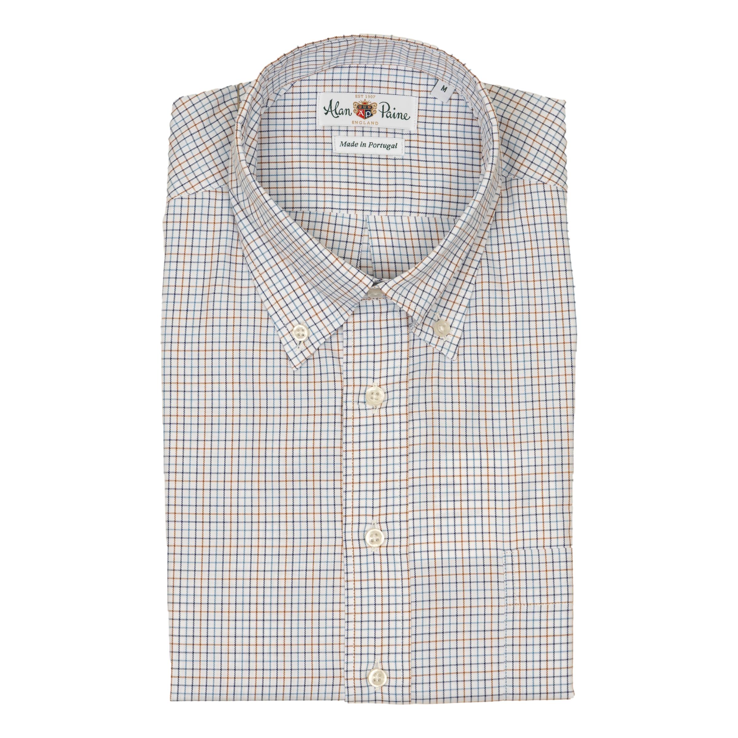 TheNavy, Indigo, and British Tan Graph Check Button Down Sport Shirt in the Classic Fit is a necessity for your closet during the Spring and Summer months. This comfortable shirt is appropriate for any occasion, day or night. With a straight fit, precise cut and perfect hem, this shirt is soon to become a favorite in your wardrobe. This shirt is 100% Cotton.