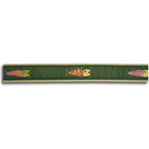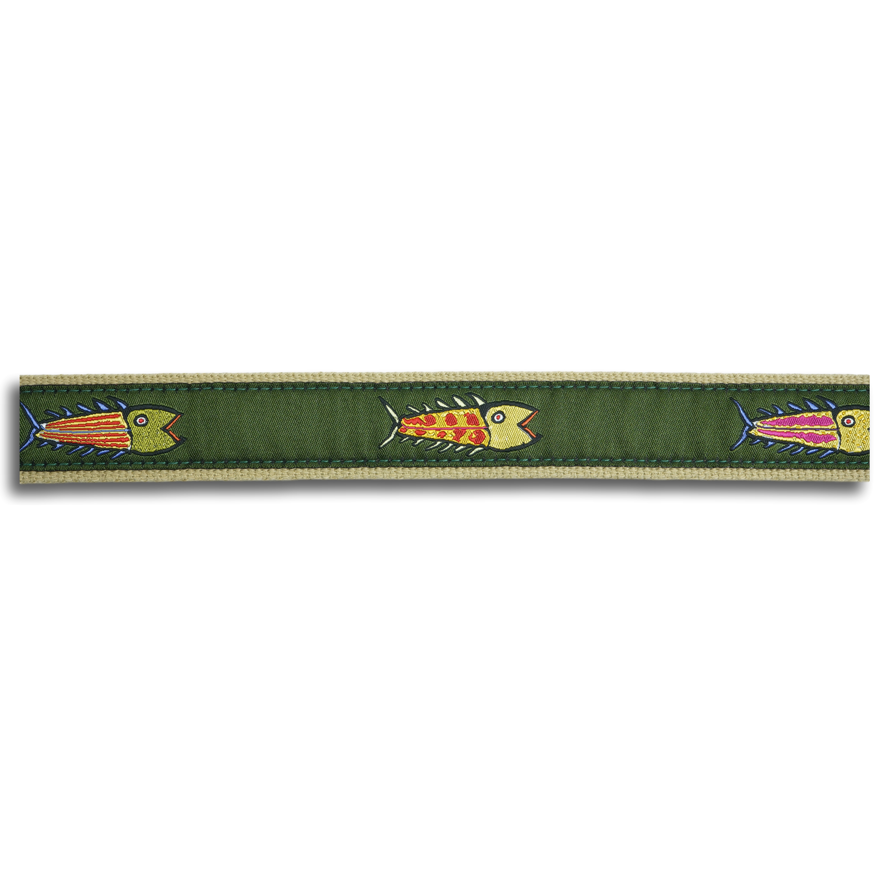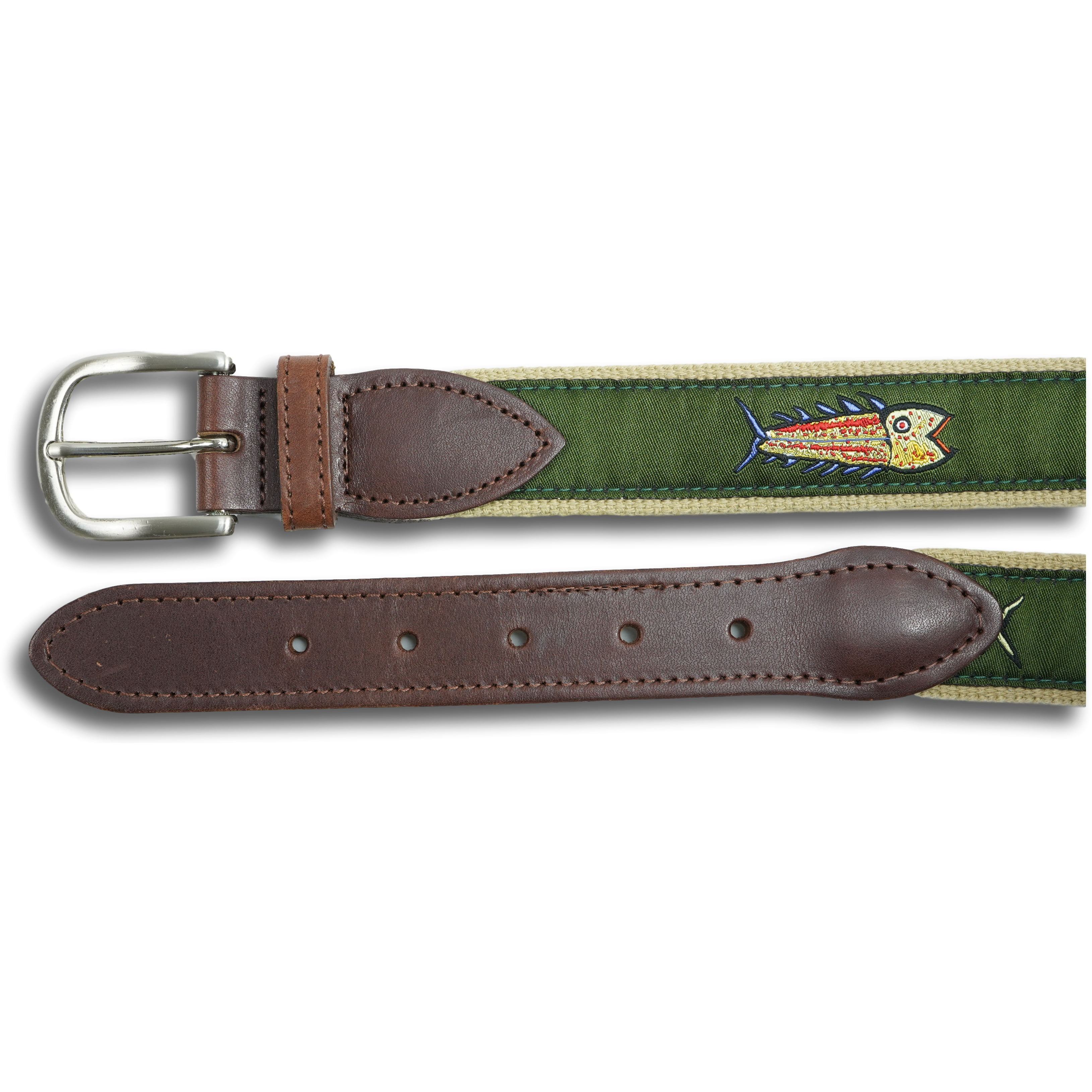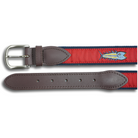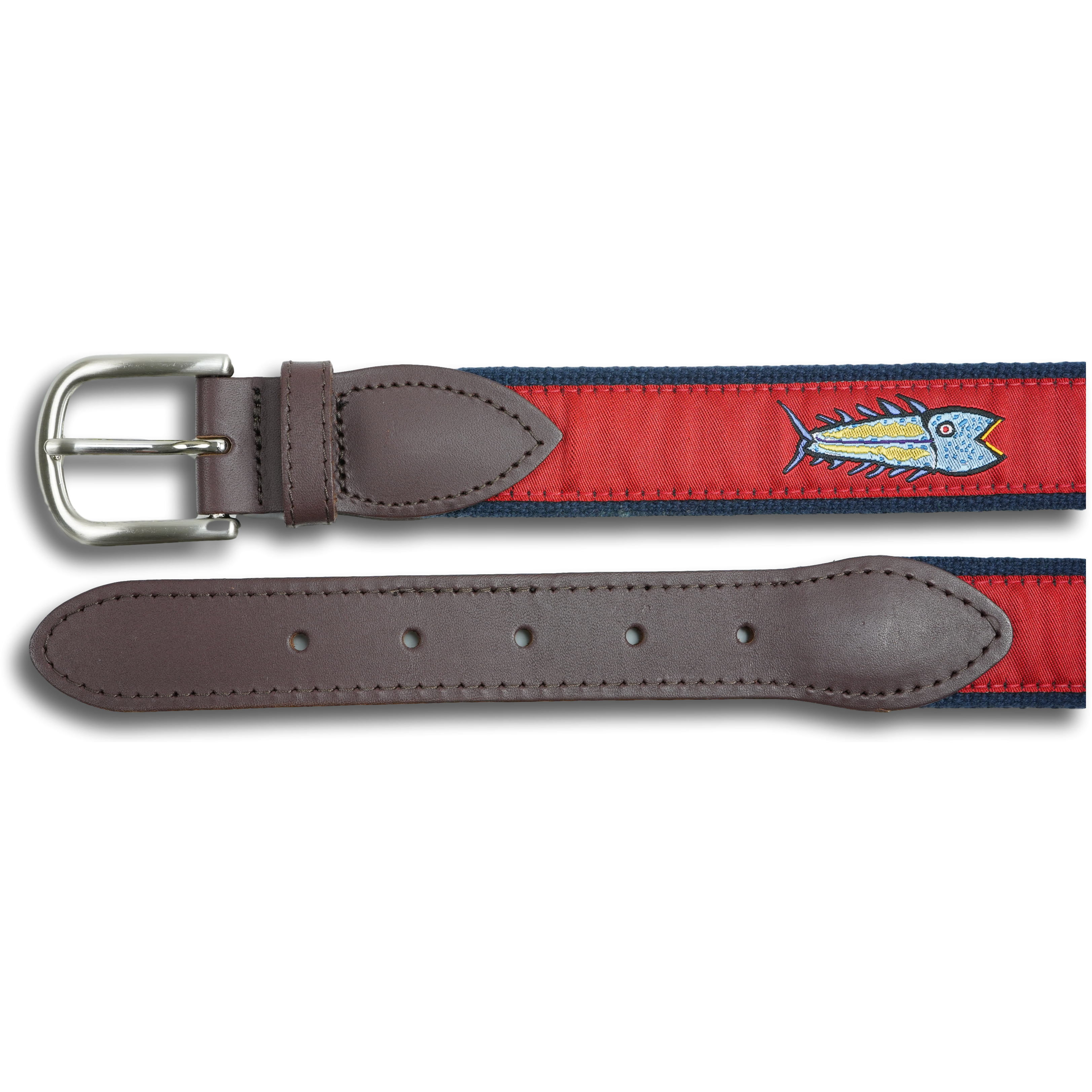 Each belt has an artist-designed signature ribbon stitched onto 100% cotton webbing and fully stitched leather tabs cut from full grain Latigo leather. Each leather tab belt is finished with solid cast brass buckles in a brushed silver finish. Proudly Made in Maine.