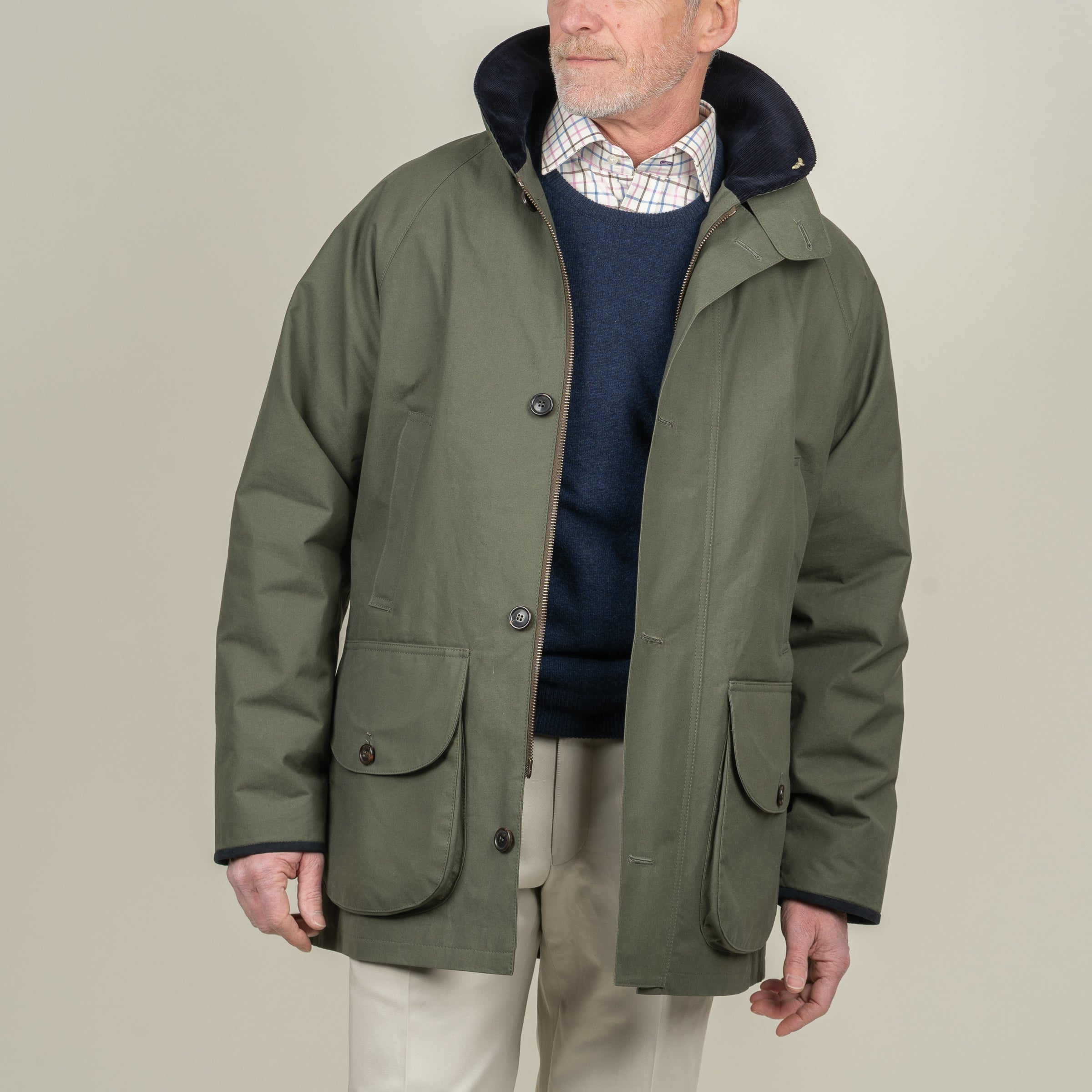 This Chiltern is a classic men's field coat handmade in England from waterproof dry waxed cotton. At home in the field or city this coat features a contrasting navy blue corduroy collar, cotton tattersall lining, bellows pockets and a heavy duty two way zipper.