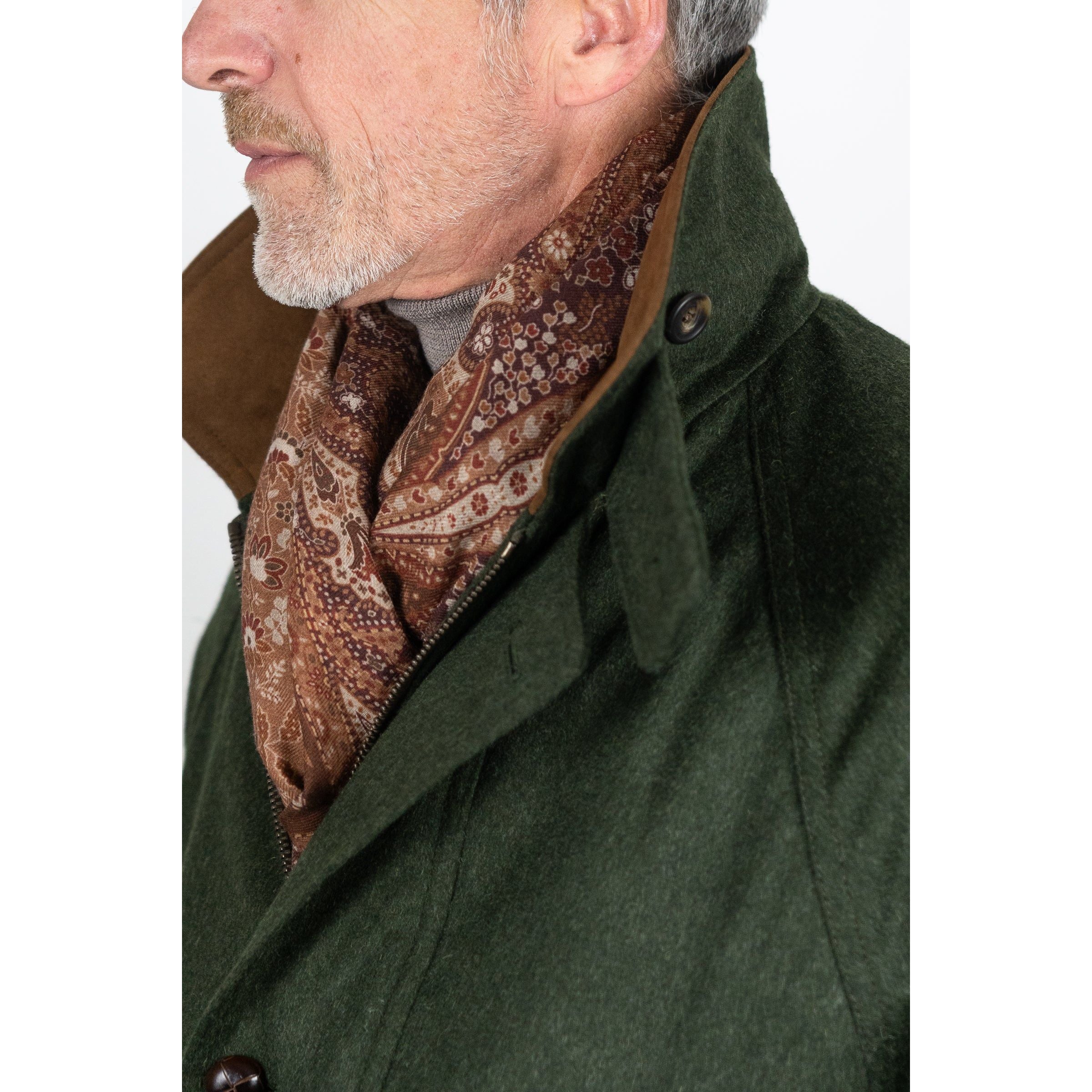 The Chiltern is our classic men’s field coat made from the finest British Loden. All Chrysalis field coats are waterproof as they incorporate a breathable internal membrane along with storm cuff, pivot sleeve. Engineering and the best of British tailoring ensures the wearer is warm, dry and comfortable at all times. This jacket features olive loden wool with a hunter orange lining.