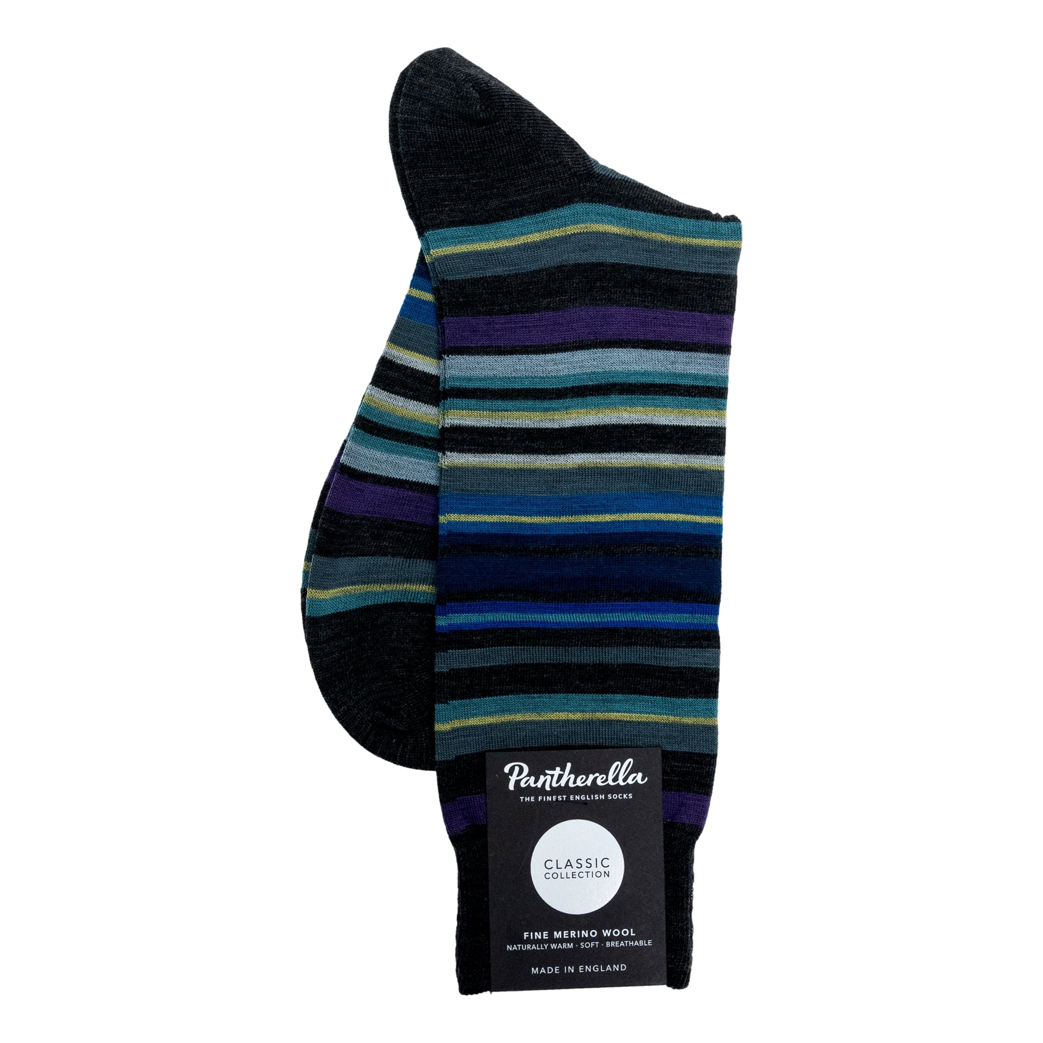The right pair of socks can make or break a workday outfit in comfort and style. Made in England, this finer men’s sock is warm, soft and breathable with 70% fine merino wool and 30% nylon. The classic ribbed design sits at the calf, and the neutral hue helps refine business looks formal and casual. Seamless toe. Hand finished. Made by Pantherella.