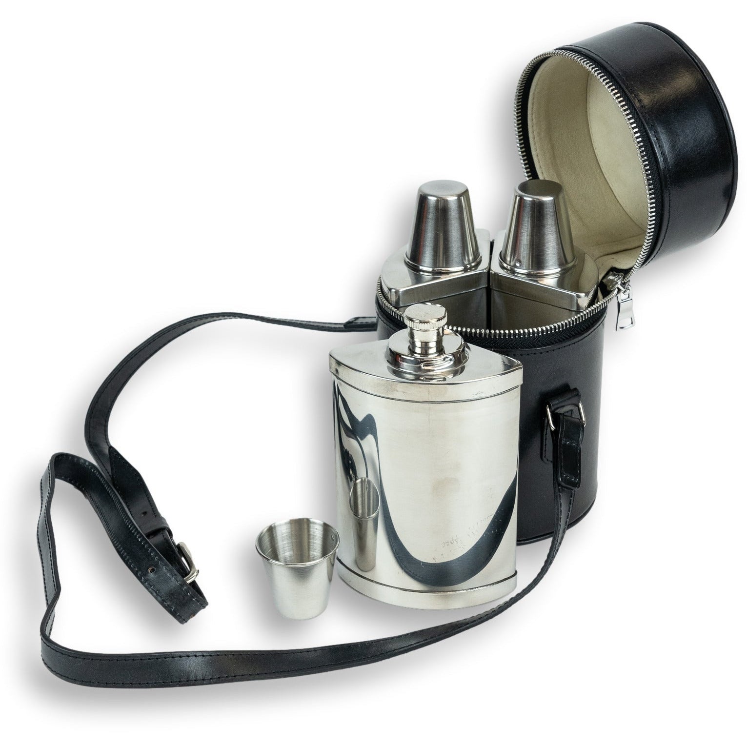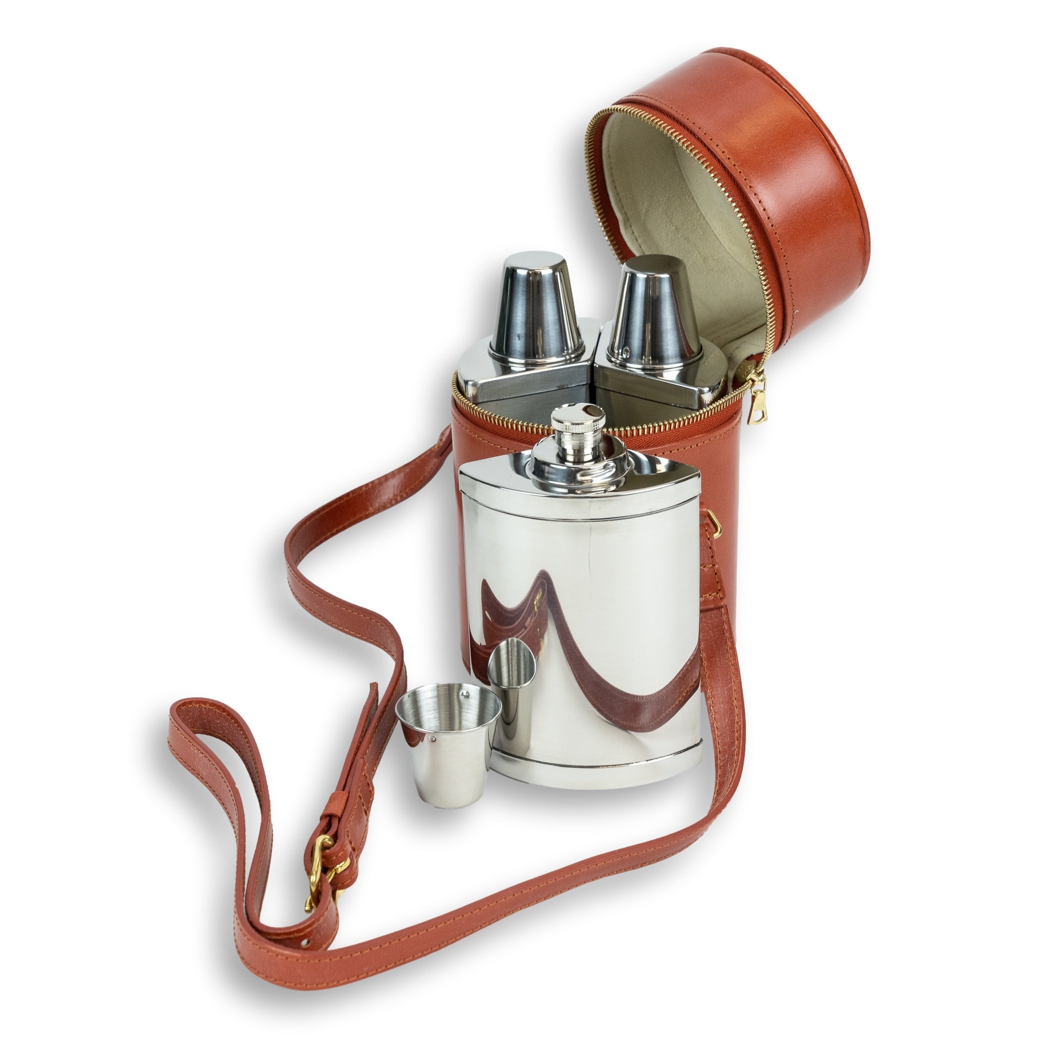 Never be without the means to mix your martini - our Triple Bar Set comprises three stainless steel flasks to be filled with your favorite tipple and accompanying mixers. All held together in a structured bridle leather case with an easy-carry shoulder strap.