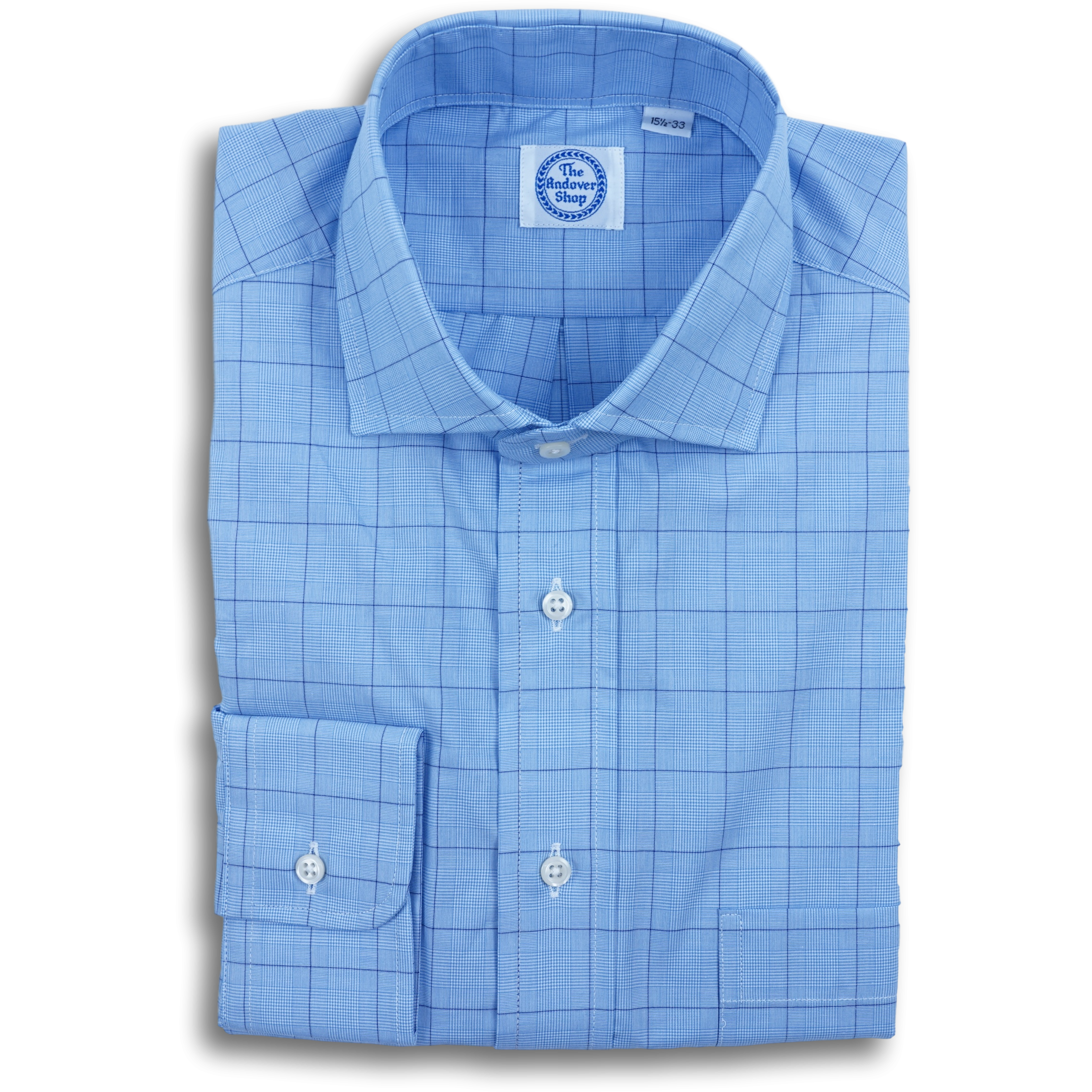 This traditional Andover fit dress shirt is made with a wider spread collar, front placket, barrel cuff and chest pocket. The navy windowpane adds an interesting detail to the classic light blue prince of wales design. Pairs well with a navy blazer and can be dressed up or down depending on the setting. Made from 100% premium cotton broadcloth in the United States.