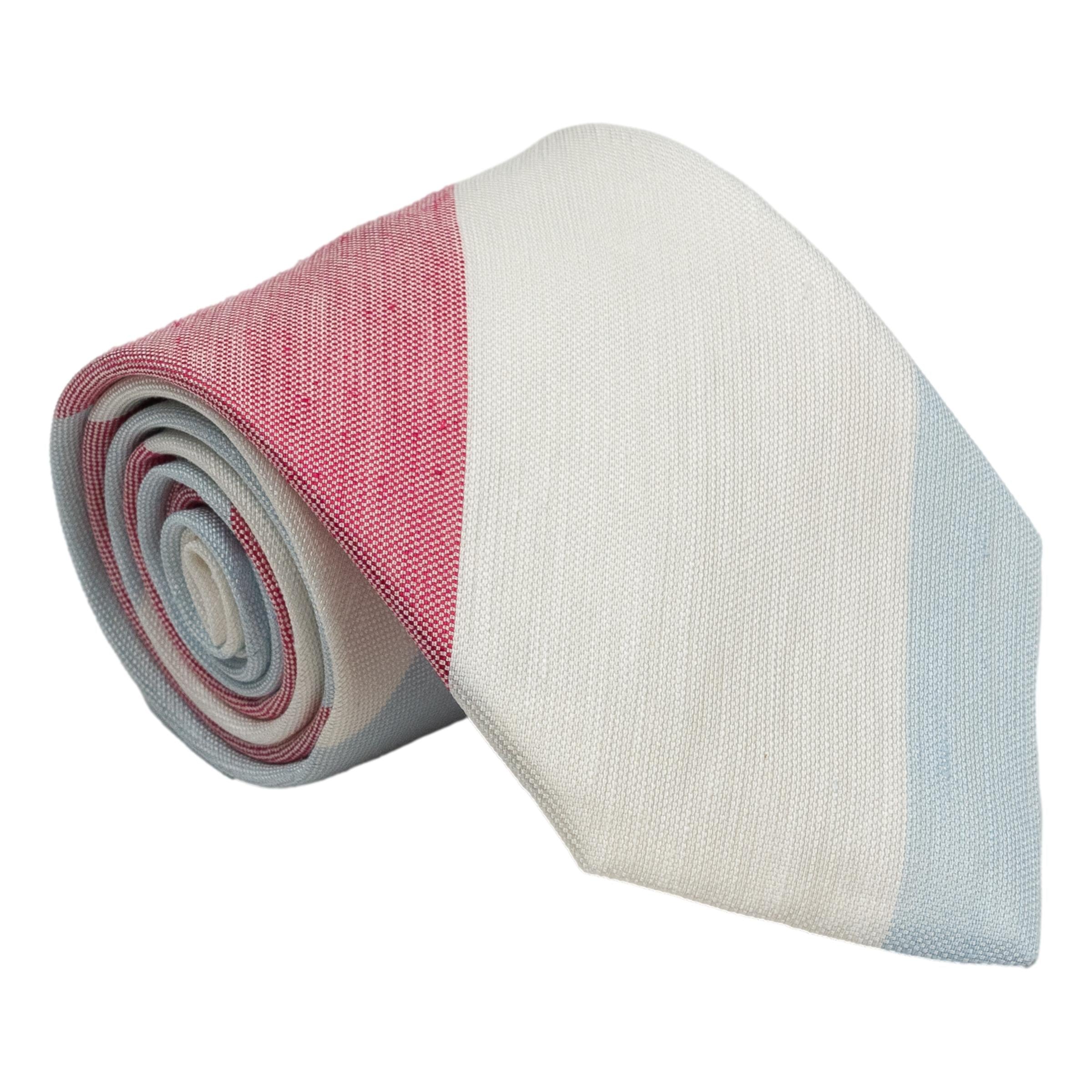 White, Light Blue, and Red Block Stripe Silk and Linen Tie