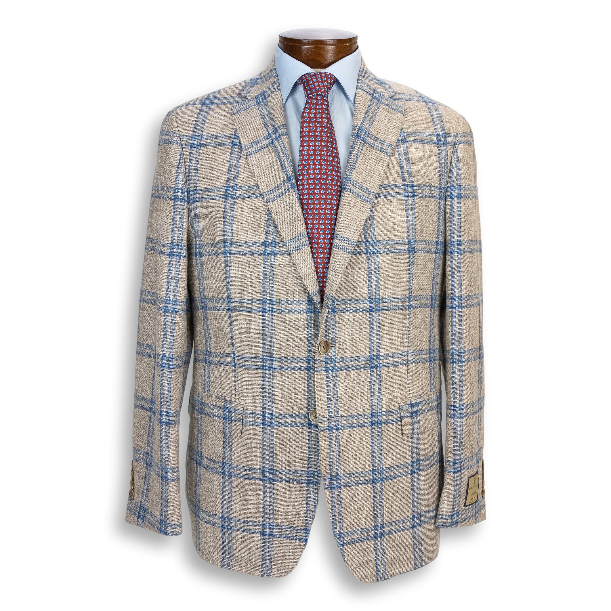 Tan with Blue Double Windowpane Wool, Cotton, and Silk Carlo Barbera Sport Coat