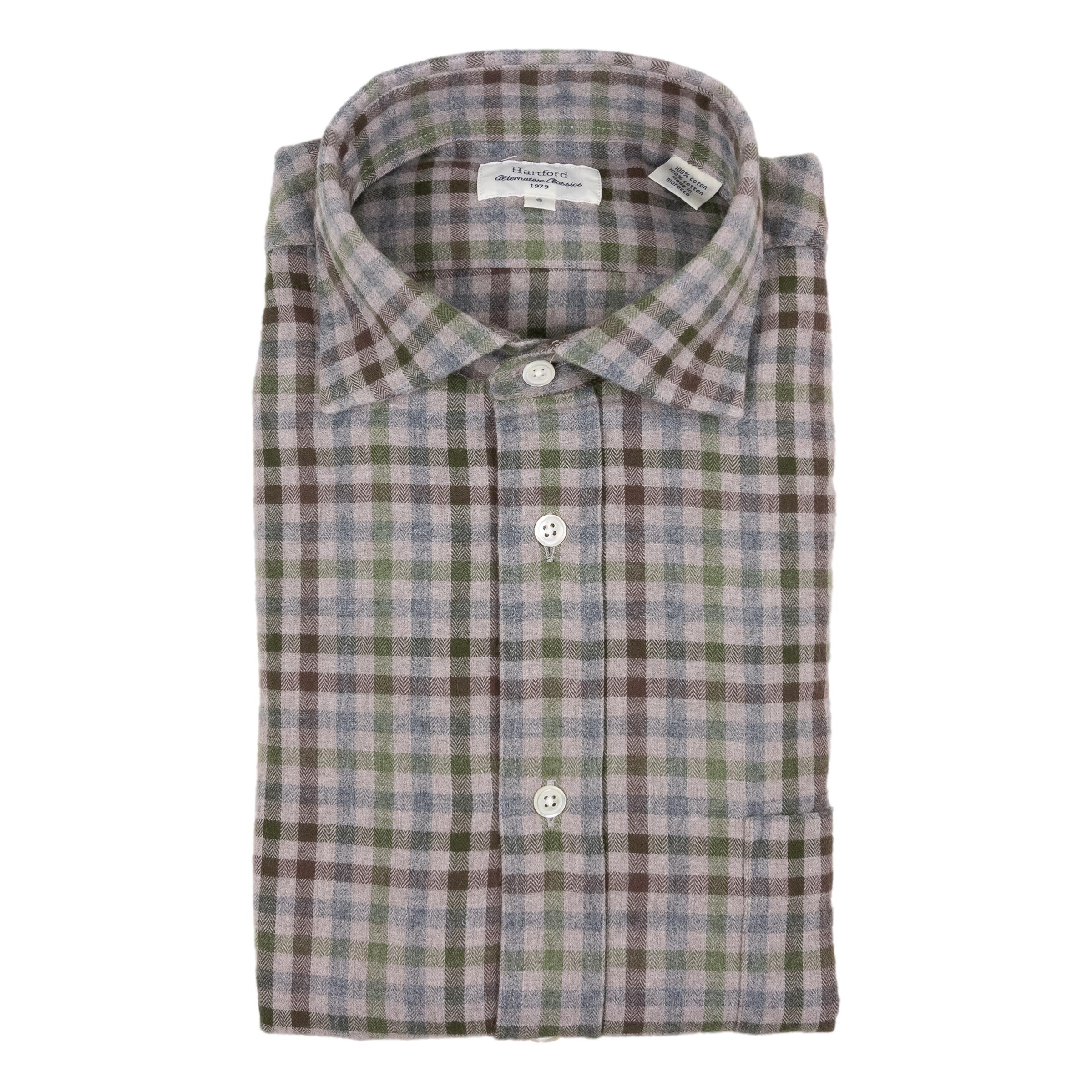 Natural and Green Check Brushed Cotton Spread Collar Sport Shirt