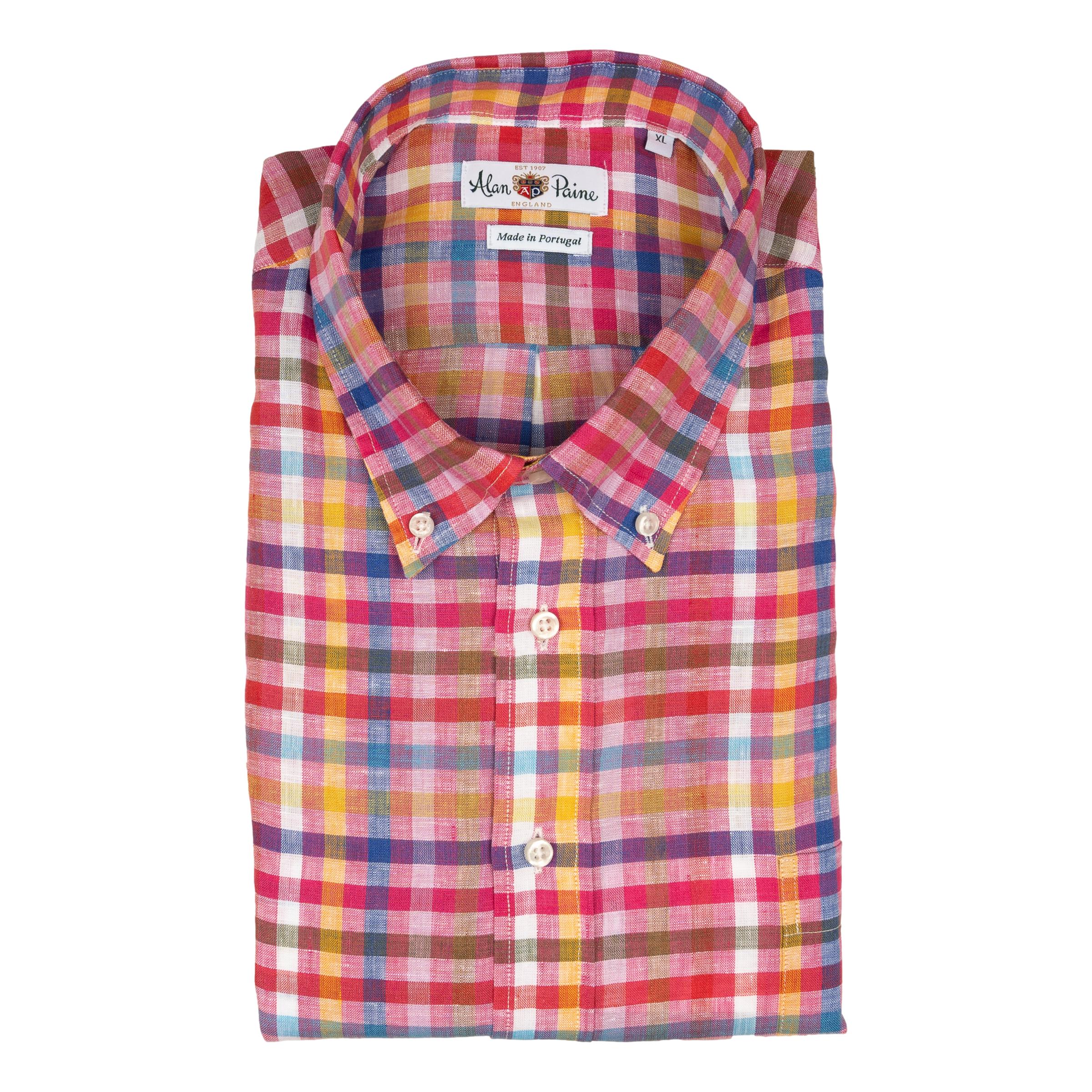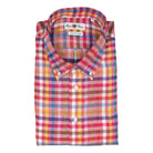 Raspberry, Yellow, Blue and White Check Linen Button Down Sport Shirt