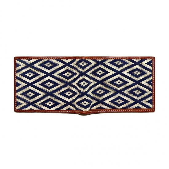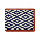 This Smathers & Branson hand-stitched crossed tennis racquets needlepoint bi-fold wallet is finished with English bull hides tanned in Italy.