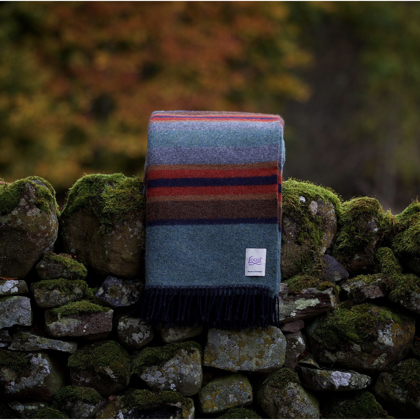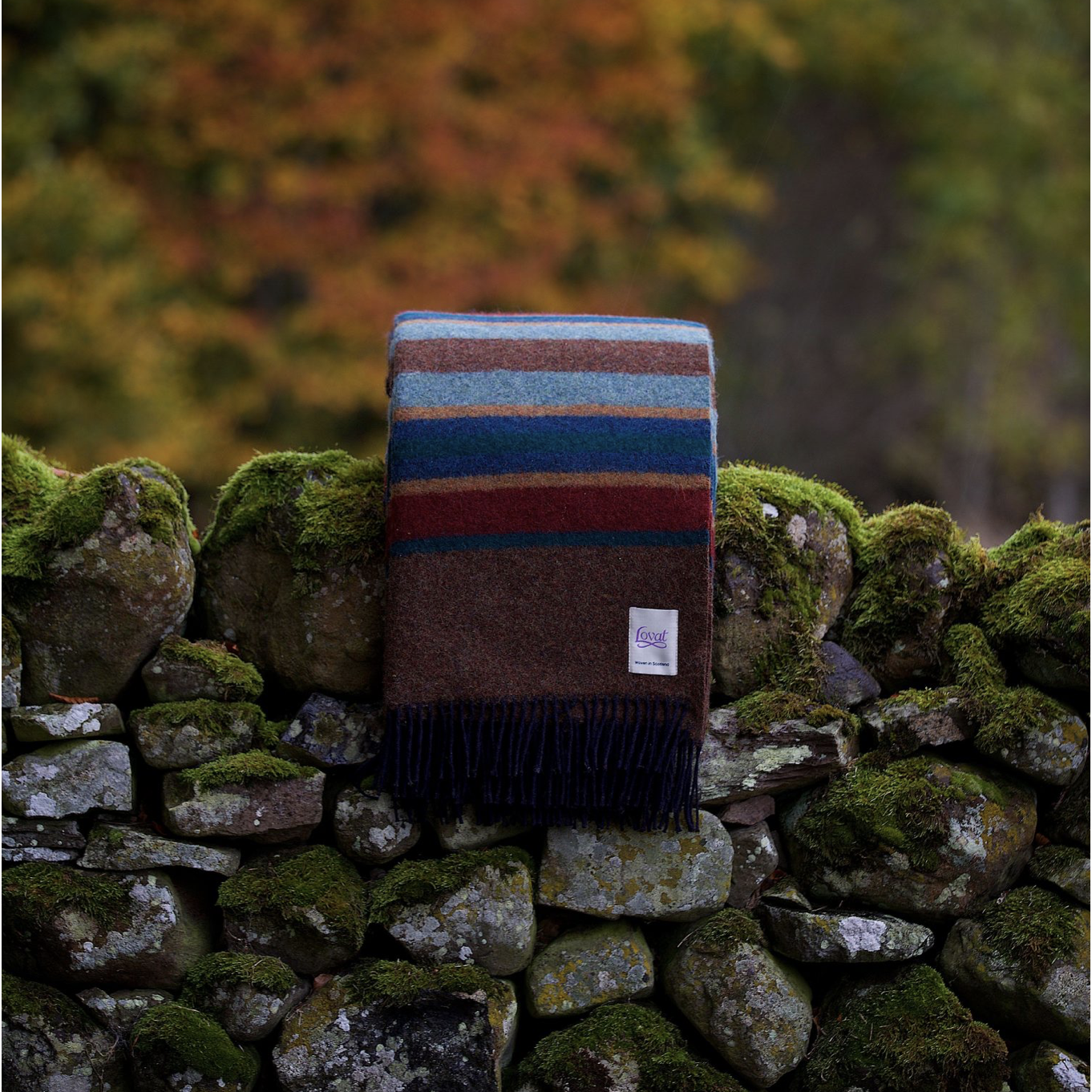 The Sundowner is a heavily milled throw made from 100% wool, creating a thick and weighty accessory. Design is inspired by the scenic Scottish countryside, classical stripes are used with rich color mixtures to establish a variation of warming country tones. A versatile throw which can be used whilst enjoying the outdoors or to snuggle up to on chilly nights.