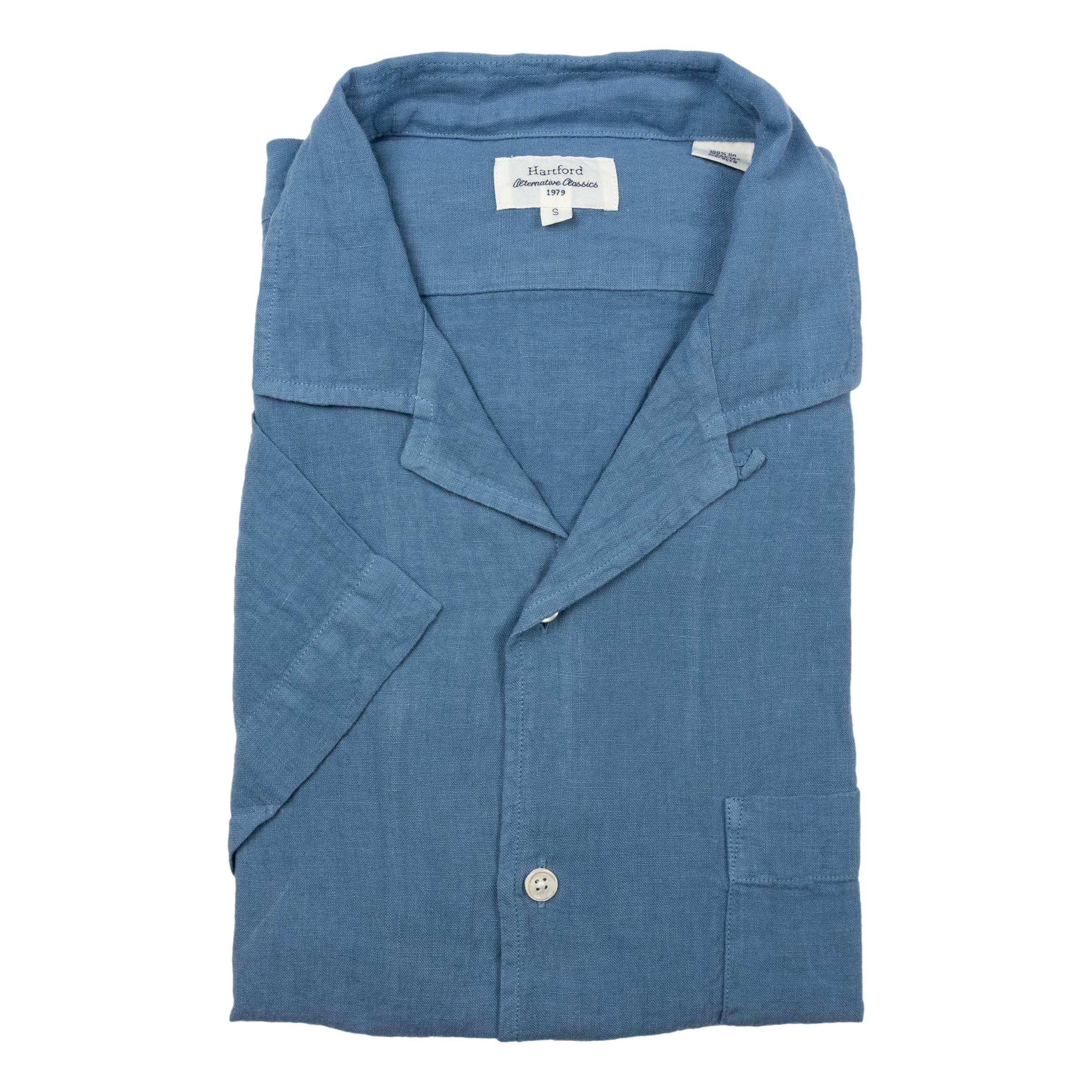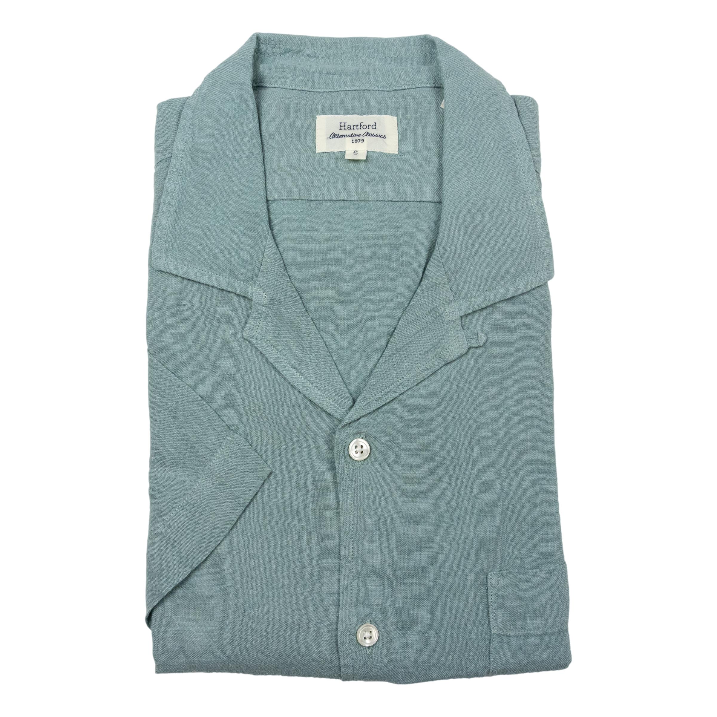 Solid Linen Palm Shirt, features a chest pocket and exposed buttoning. Its regular fit is universal and its slightly open collar is a classic in our wardrobe. The quintessential short sleeve casual shirt, timeless and essential in all circumstances. This shirt is garment-dyed, giving the color a subtle, washed effect and softening its feel. Regular fit.
