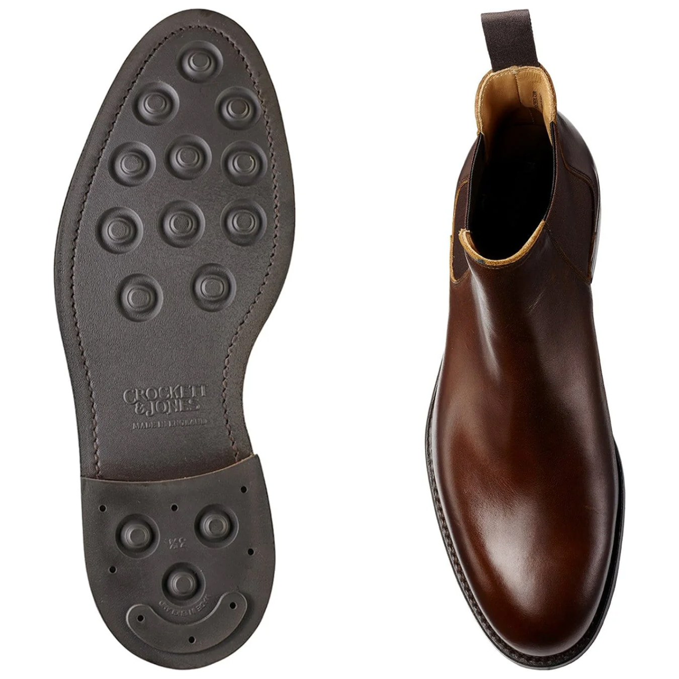 The Chelsea 5 Boot from Crockett & Jones is a Chelsea boot made from fine quality dark brown waxed calf leather for added water resistance, with Dainite rubber soles.
