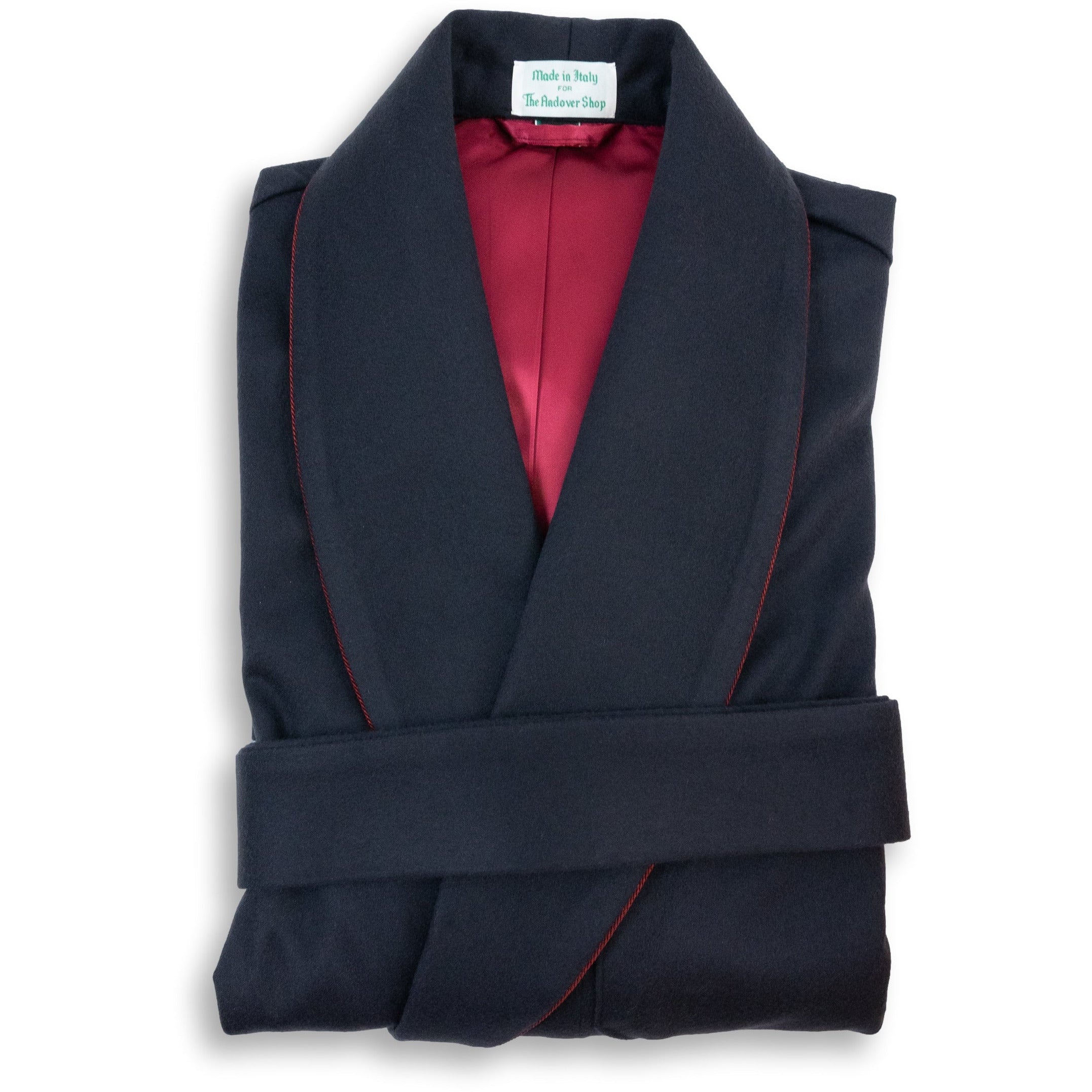 Made in Italy for The Andover Shop, this dressing gown features a classic shawl collar, bemberg lining on the shoulders, bordeaux twisted cord piping, left chest pocket, two hip pockets, and a belt. It is 10% cashmere and 90% wool.