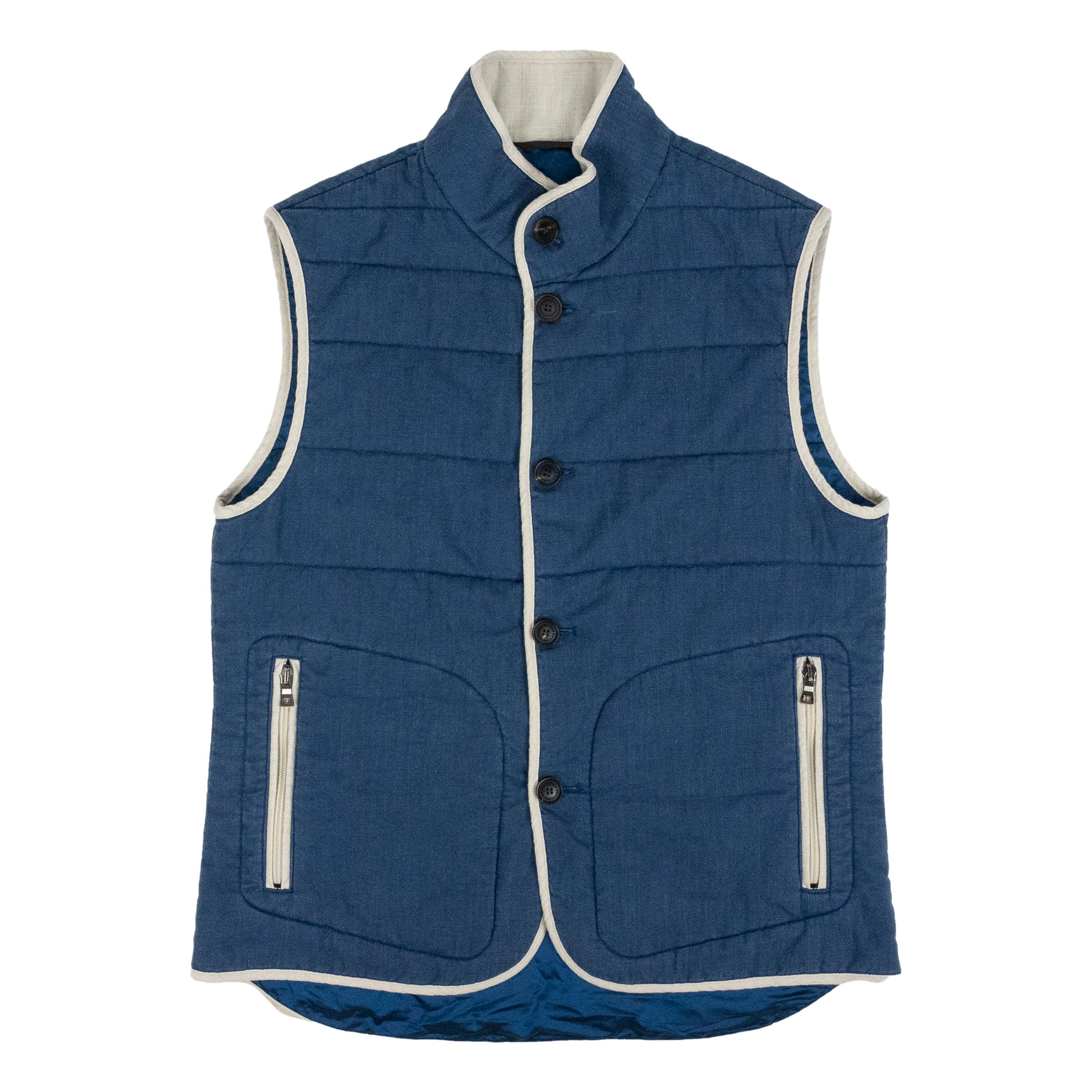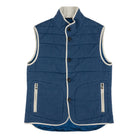 Discover the timeless charm of the Blue Garment Dyed Linen Waterville Vest, meticulously crafted in Italy for The Andover Shop. The front-button closure adds sophistication, making it a versatile layering piece for both casual and semi-formal occasions. Perfect for elevating your style while staying cool and comfortable. Made from premium Italian materials and hardware, it seamlessly combines style and functionality. For the perfect fit, we suggest choosing a size one up from your jacket size. Embrace Italian craftsmanship and style with the Blue Garment Dyed Linen Waterville Vest – where sophistication meets everyday wear.