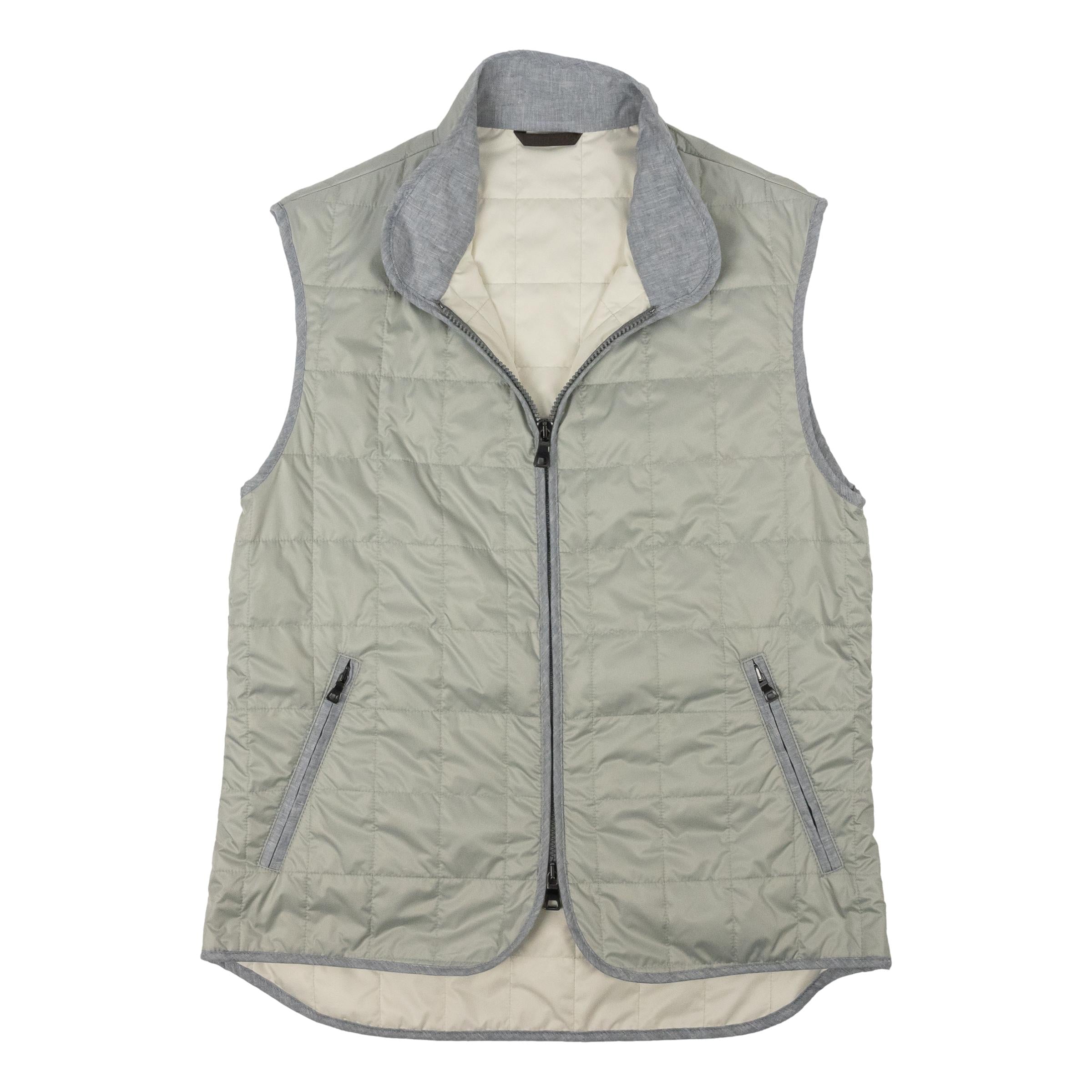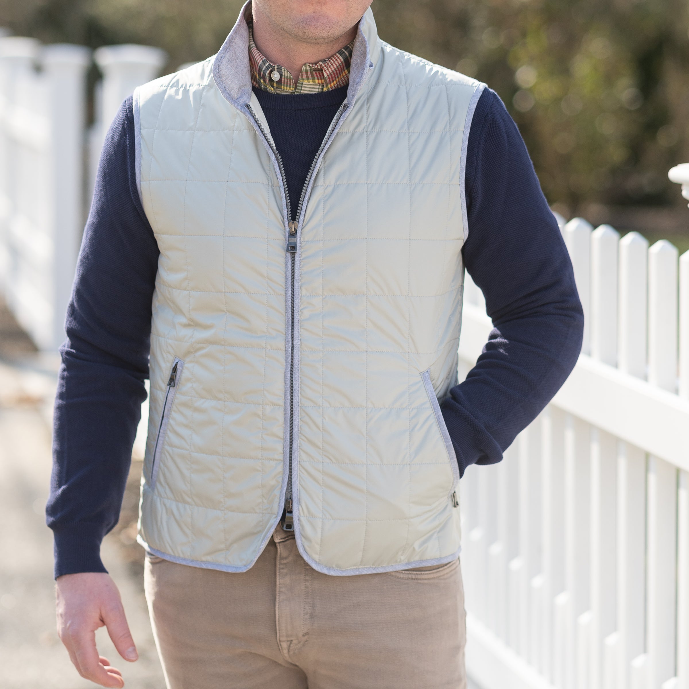 Discover the timeless charm of the Green Lily Waterville Theo Vest, meticulously crafted in Italy for The Andover Shop. This versatile vest is a wardrobe essential, featuring a convenient 2-way front zipper, along with zippered hand pockets and two interior pockets for practicality. Made from premium Italian materials and hardware, it seamlessly combines style and functionality. With its year-round appeal, this vest effortlessly complements any ensemble. For the perfect fit, we suggest choosing a size one up from your jacket size. Embrace Italian craftsmanship and style with the Green Lily Waterville Theo Vest – where sophistication meets everyday wear.