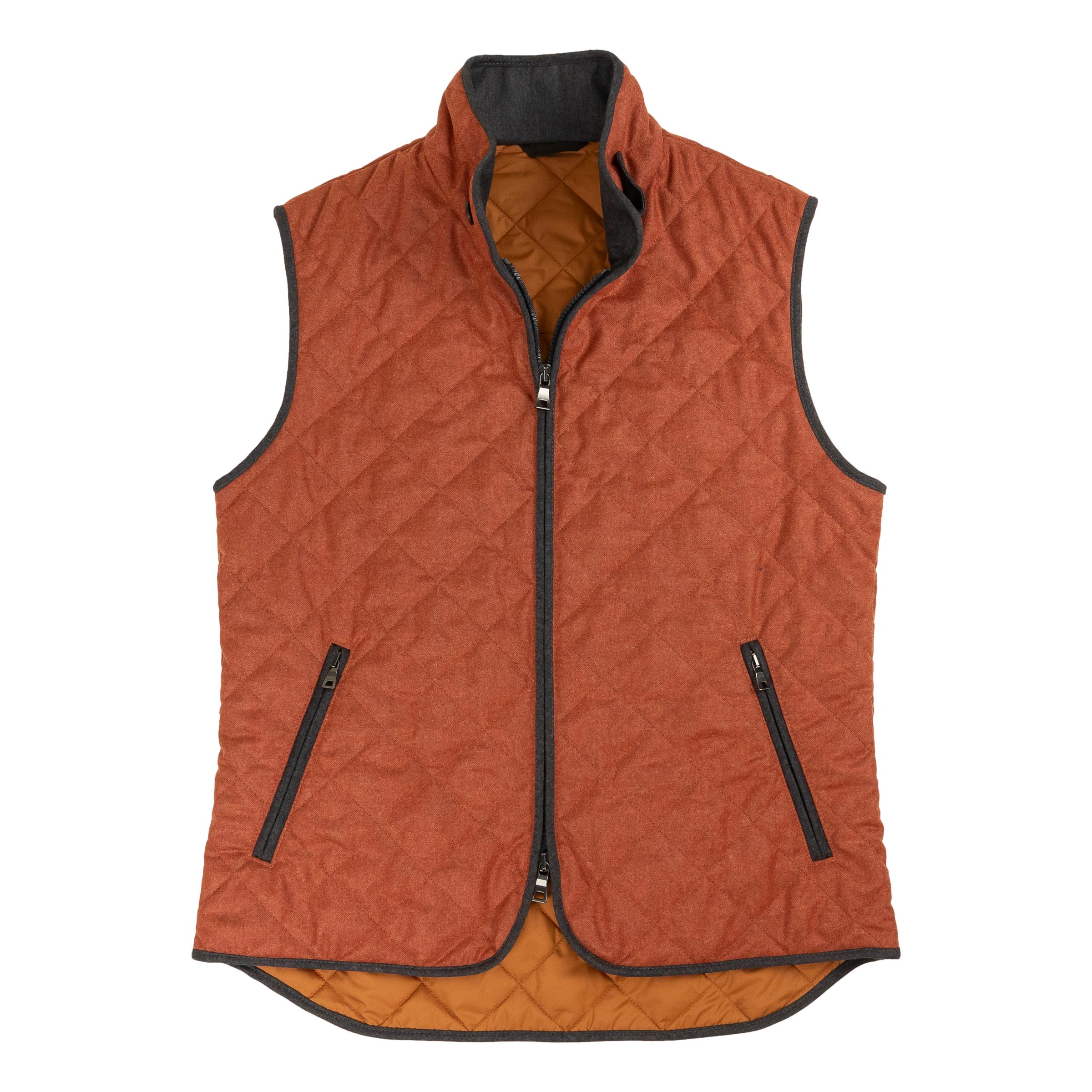 The iconic Waterville Barberis Flannel vest is made from 100% water-repellant Vitale Barberis wool and is complete with a 2-way front zipper, zippered hand pockets and two interior zippered pockets. This lightly quilted vest is designed with versatility in mind and can be worn from early Fall to late Spring. We recommend going one size up from your jacket size. Made in Italy for The Andover Shop using all Italian materials and hardware.