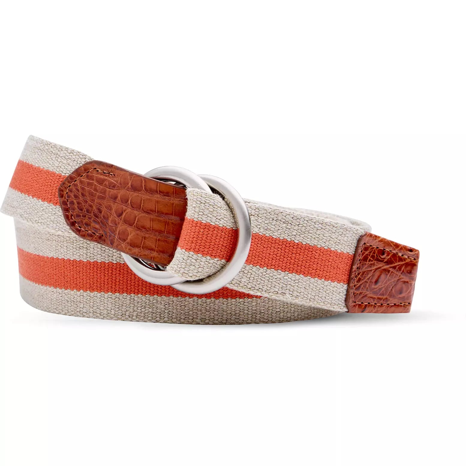 Casual styling combines with refined touches to create a comfortable belt that adds a just-right amount of polish to your everyday style. Stretch linen has a bold center stripe and is accented with leather tabs in the same color. Brushed nickel O-rings complete the casual look. 1-3/8" wide.