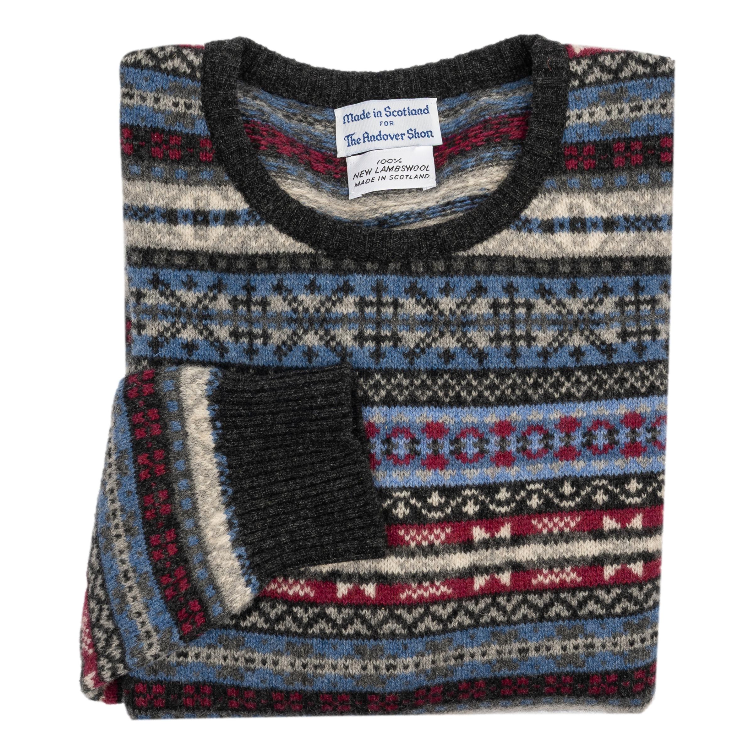 100% Lambswool. Made in Scotland for The Andover Shop. This Ladies Lambswool Fairisle Crewneck Sweater in a beautiful Charcoal, Cranberry, and Light Blue is a warm fall and winter sweater. An awesome layering piece that will soon be your most loved sweater!