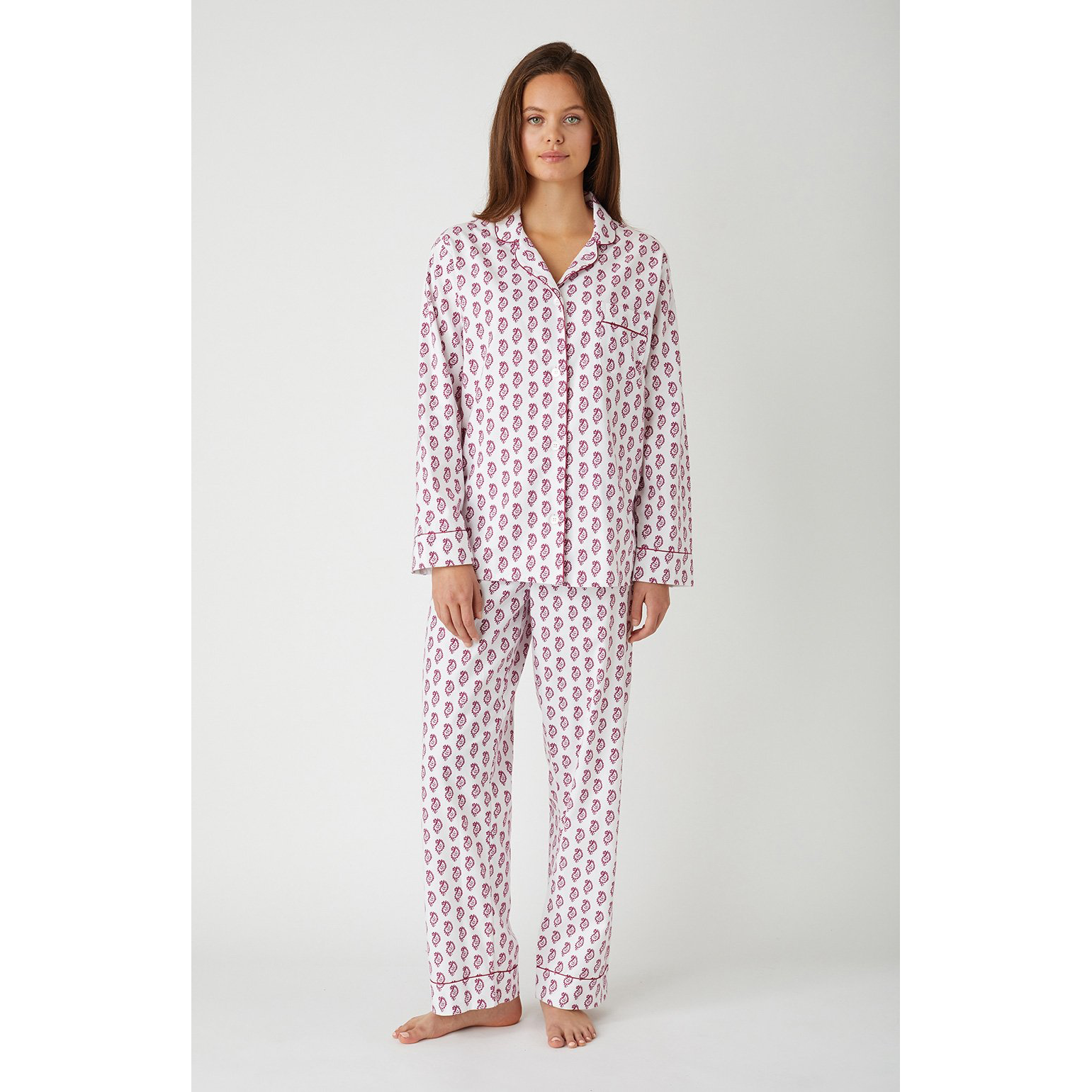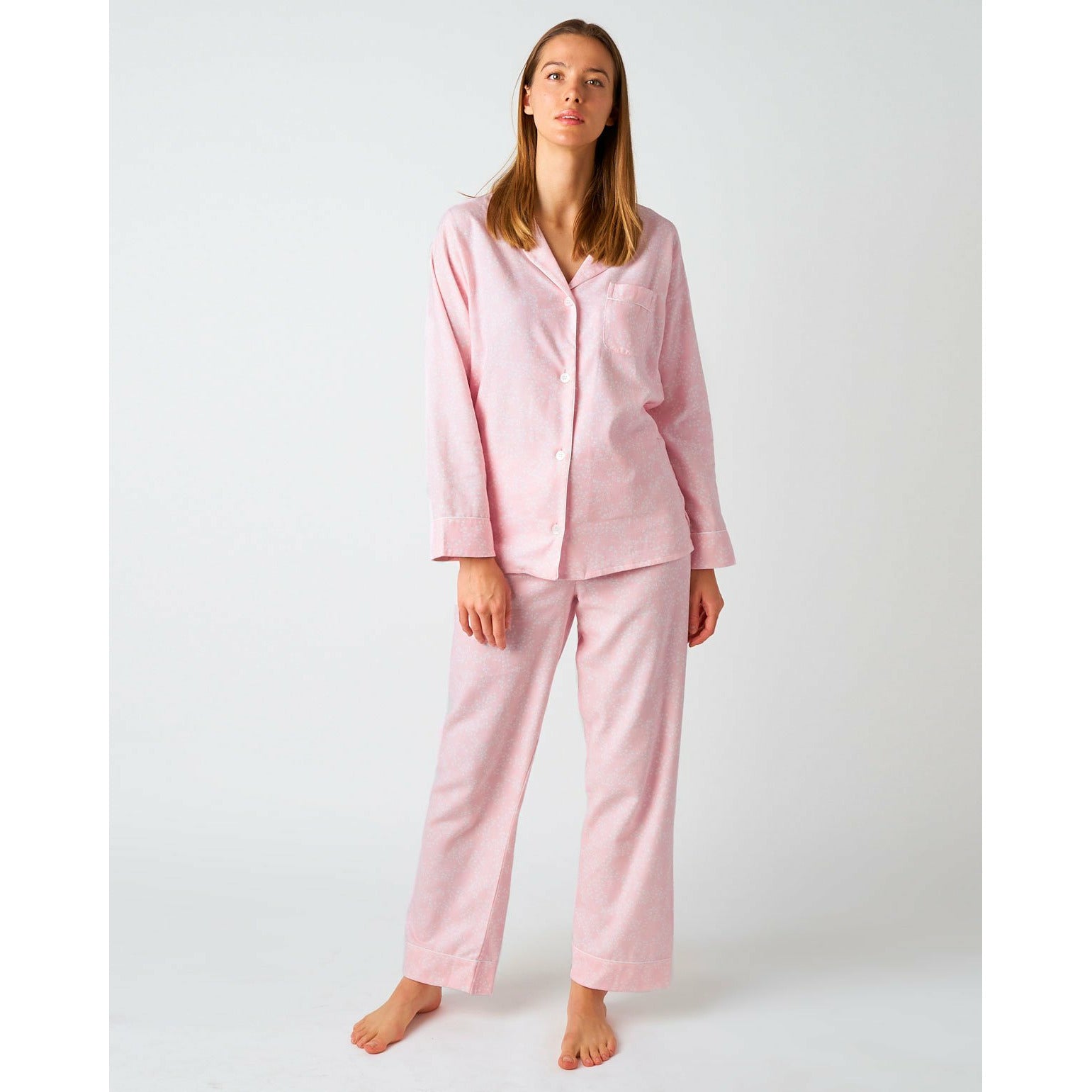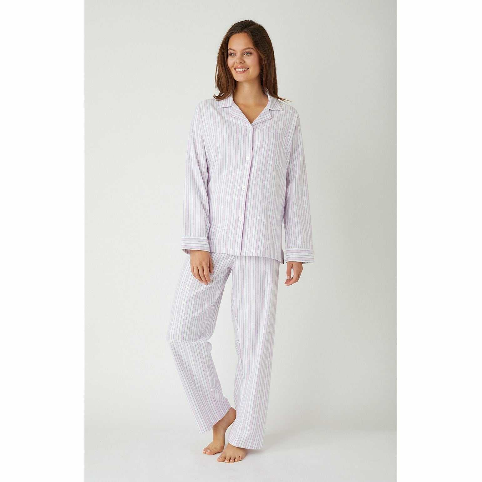 Soft, 100% brushed cotton makes these pyjamas super cosy all year long. Whether you wear them for sleeping or lounging these pyjamas will ensure you look smart and stylish. Generously cut with a square-hemmed jacket and a half-elasticated waist with a self-fabric tie trouser. Both are finished with piping. Flannel.