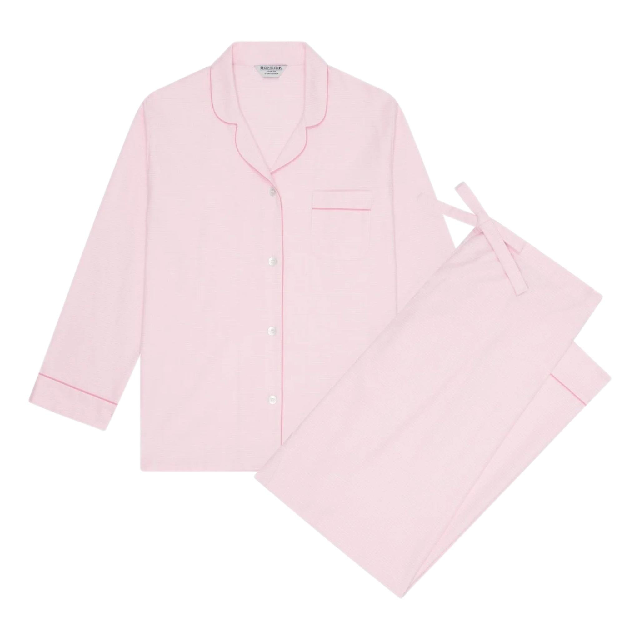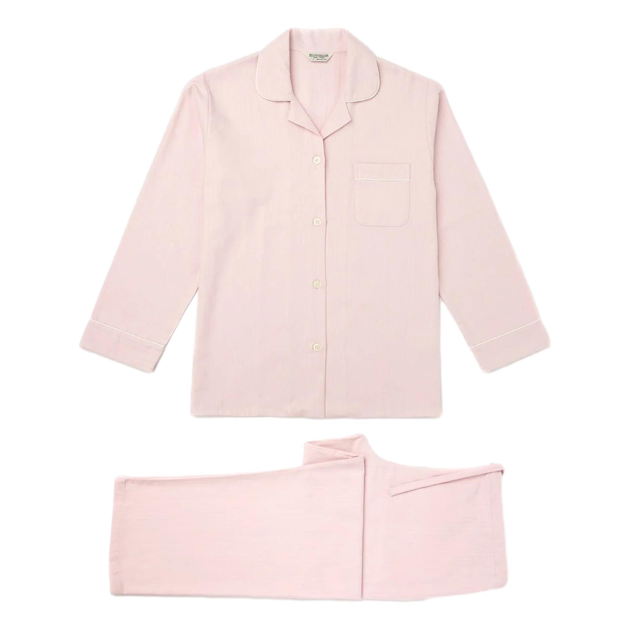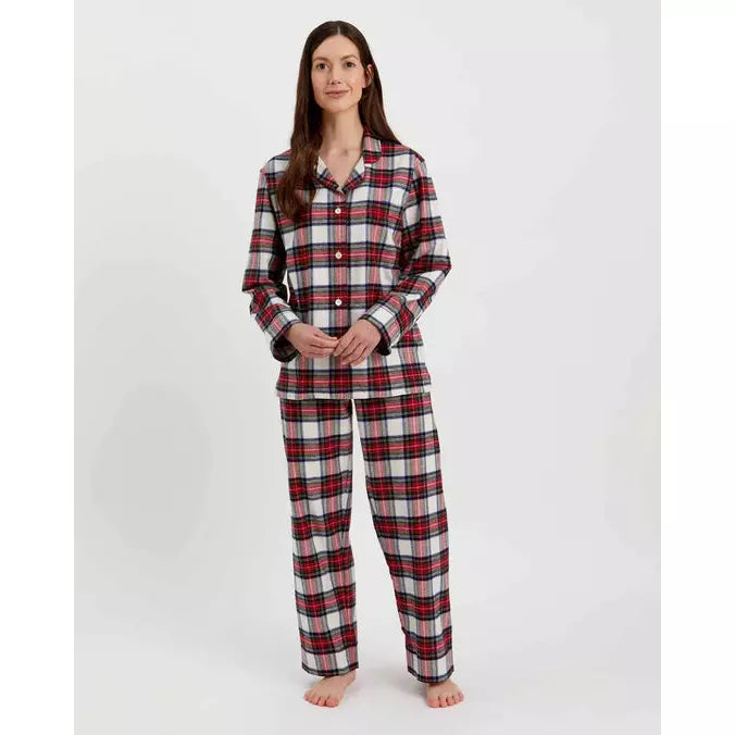 Soft, 100% brushed cotton makes these pyjamas super cosy all year long. Whether you wear them for sleeping or lounging these pyjamas will ensure you look smart and stylish. Generously cut with a square-hemmed jacket and a half-elasticated waist with a self-fabric tie trouser. Both are finished with piping. Flannel.
